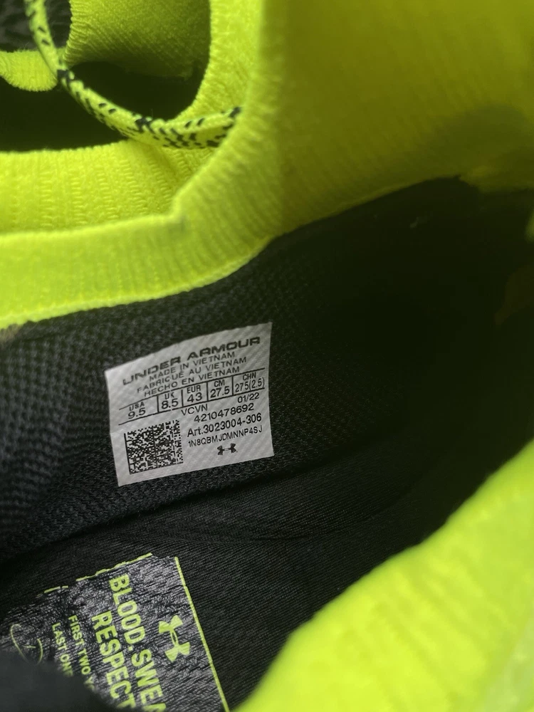This is a pre-owned pair of Under Armour Project Rock 3 sneakers in size 9.5 for men. The color is High-Vis Yellow/Black/High-Vis Yellow, featuring a mesh upper material and a vibrant design. The style code is 3023004-306, released in 2021 with a release date of 20210205. Made in Vietnam, these athletic shoes are part of the Under Armour Project Rock product line.
