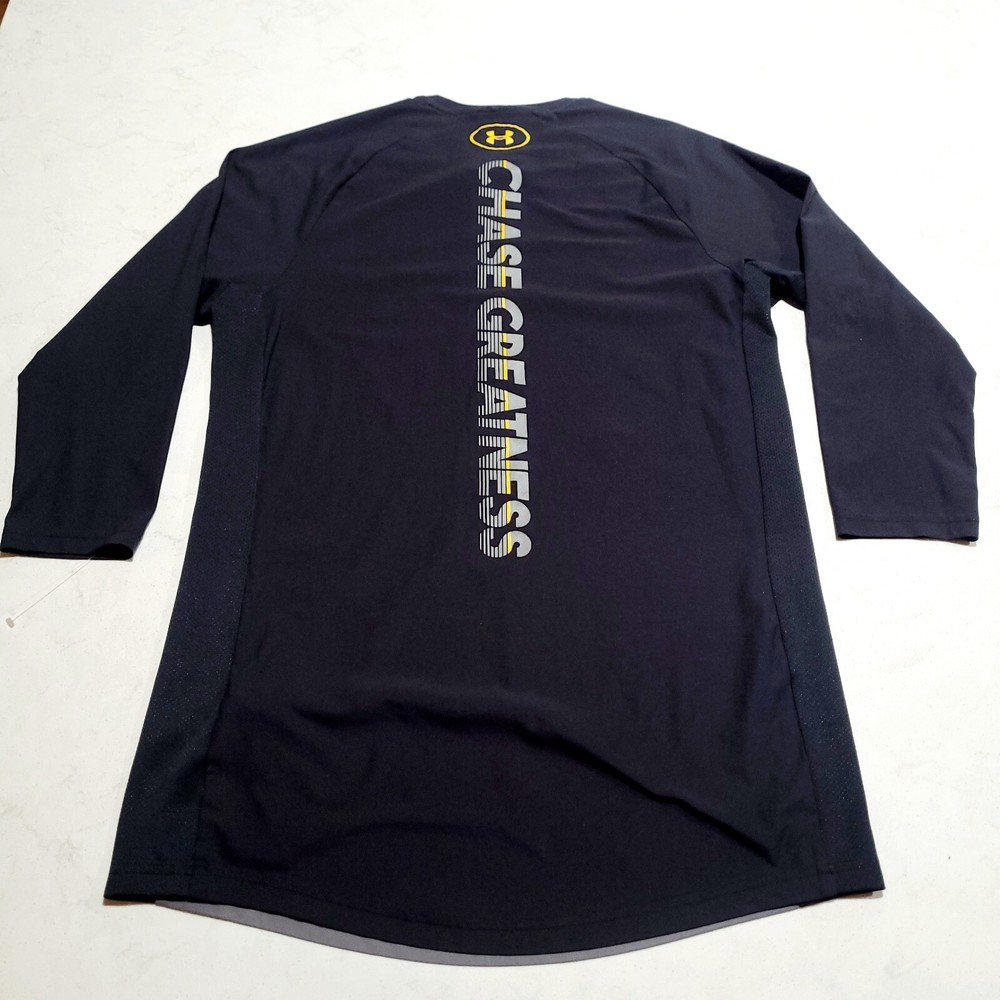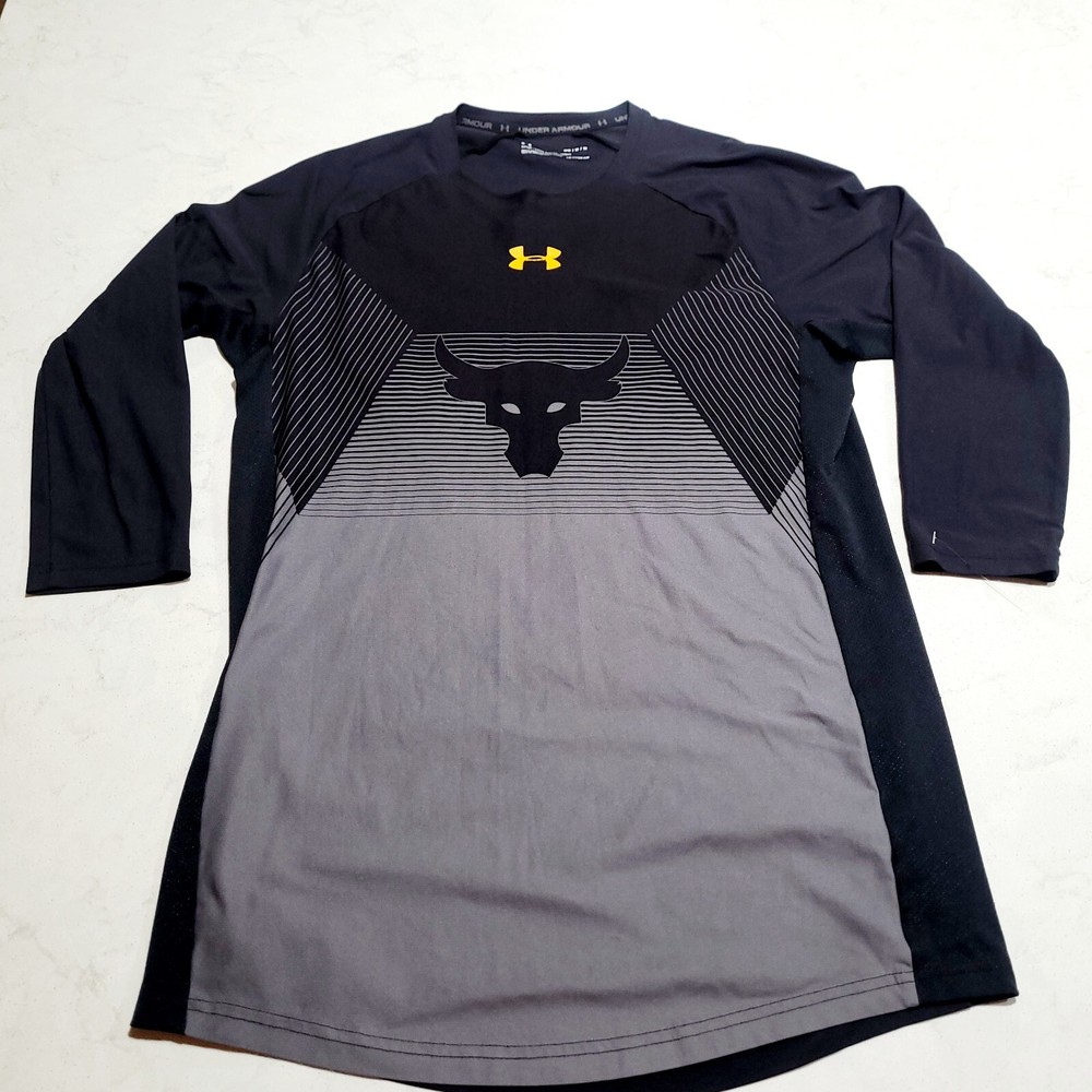 PRE OWNED. IN EXCELLENT CONDITION. PLEASE VIEW ALL PHOTOS ABOVE FOR MEASUREMENTS AND PROOF OF CONDITION. STORED IN A CLIMATE CONTROLLED SMOKE-FREE AND PET-FREE HOME. SHIPS PROMPTLY AND SECURELY. The "Under Armour Project Rock UA 3/4 Sleeve Fitted Shirt" is a men's activewear top in size Medium. It features a crew neck and a pullover style, made of breathable 100% polyester fabric in black. The shirt showcases the logos of "Chase Greatness", "The Rock", and a bull character, embodying a sports theme. With a compression level of firm, this shirt is suitable for gym and training activities, designed for comfort and performance. It is part of the Under Armour Project Rock product line, reflecting a collaboration with Dwayne "The Rock" Johnson.