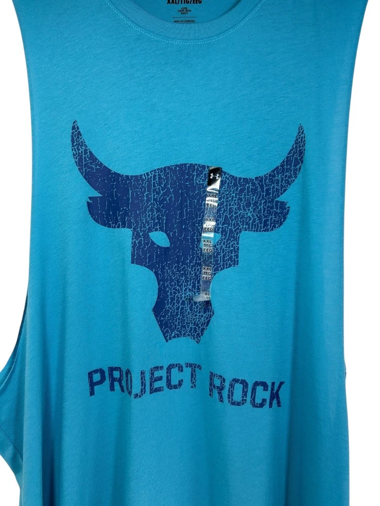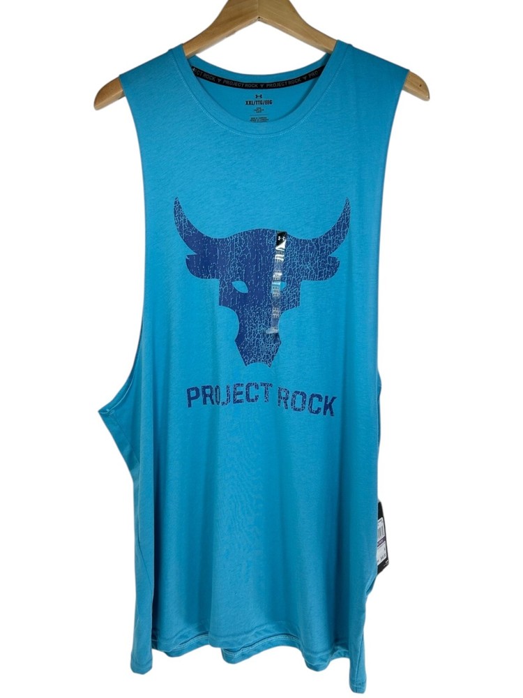 New with tags; hard to find tank! Under armor project rock Brahma bull tank top in two tone blue Mens XXL Bull logo on front with 'Project Rock' underneath Round crew neckline Sleeveless Moisture wicking and lightweight Great for the gym or any athletic/casual occasion Relaxed fit Made with polyester/Cotton Made in Cambodia #underarmour #underarmourprojectrock #tanktop #underarmourtanktop #projectrock #underarmourmens #underarmourshirt #underarmourtank #underarmourprojectrocktanktop