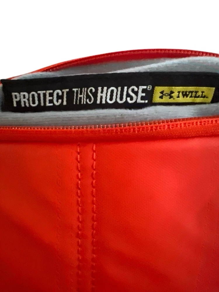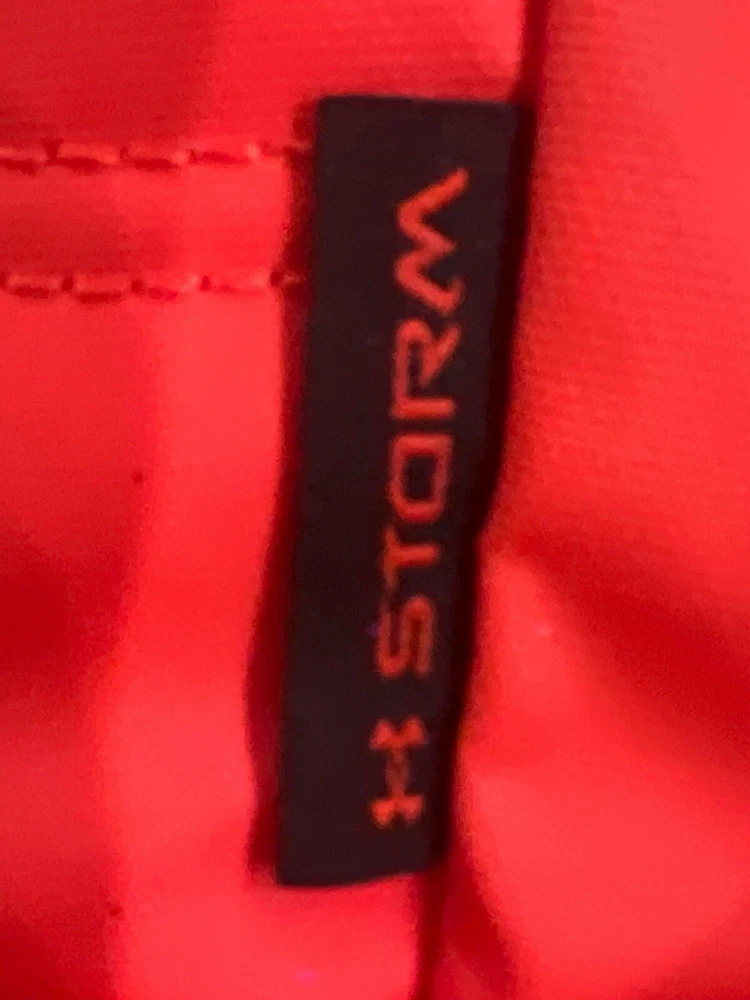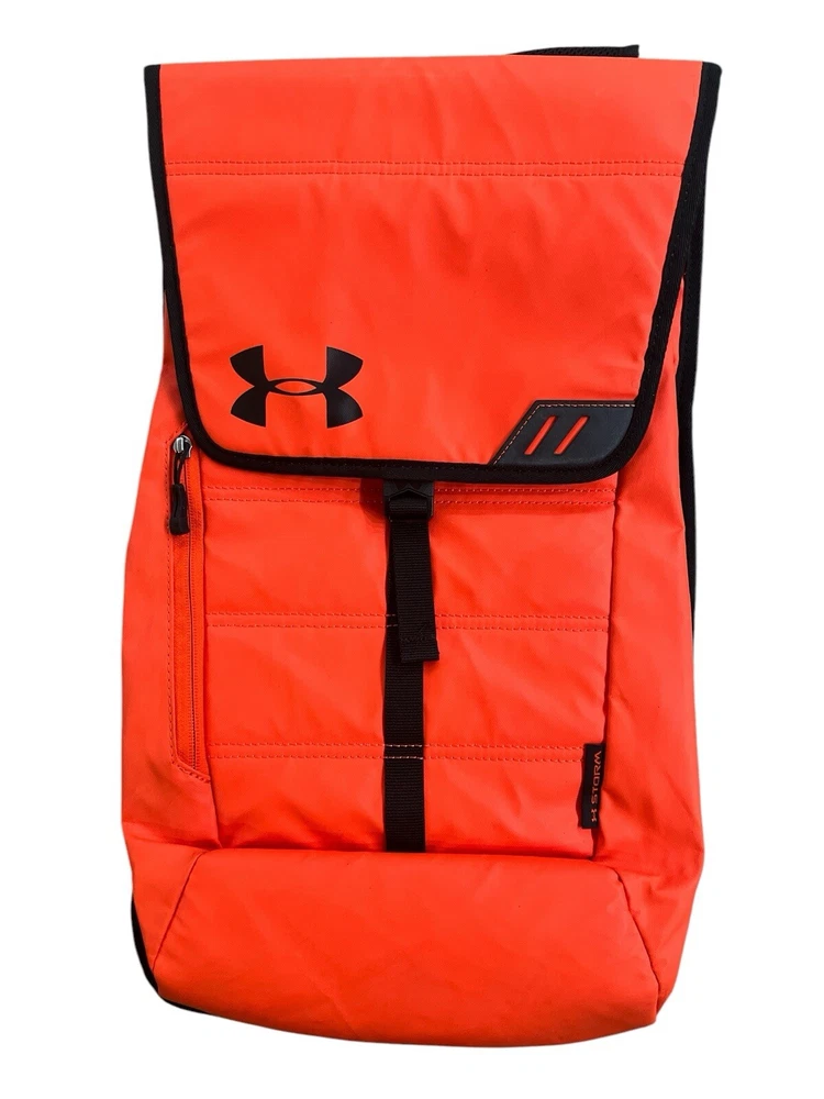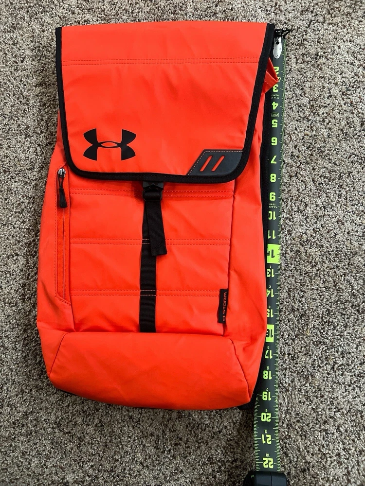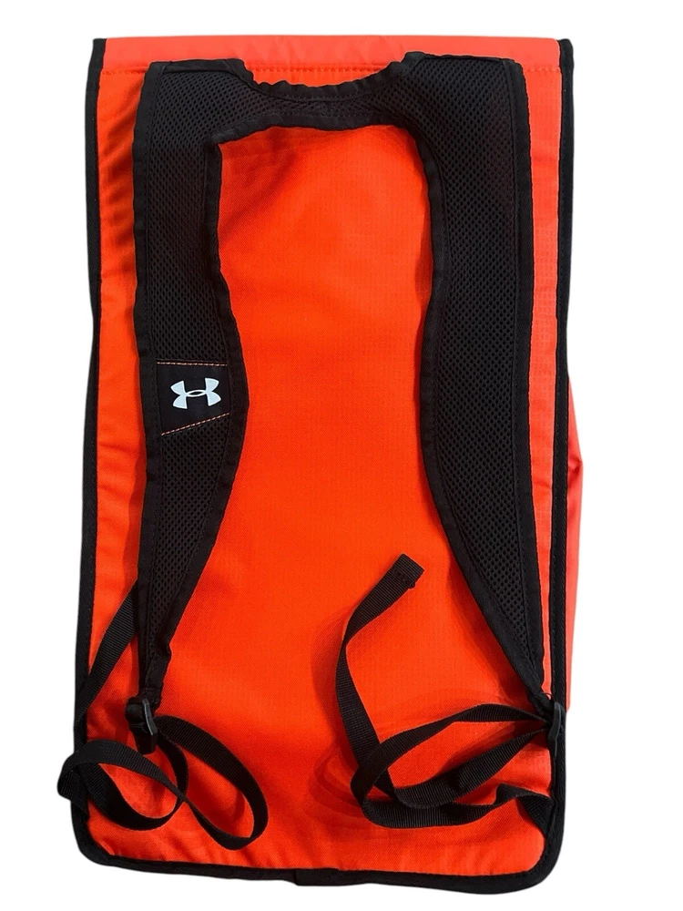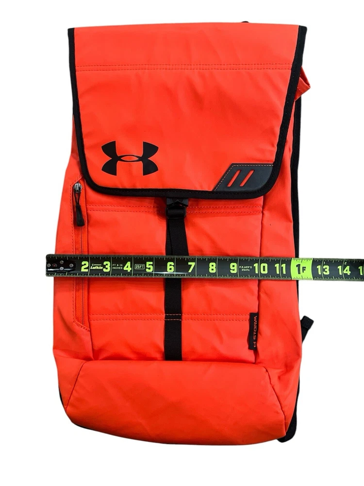 Under Armour UA Storm Tech Orange &Black Weather Resistent Sackpack Laptop Backpack. Two Small Long Zip Pockets. One Outside, One Inside. Very Good Condition. No Stains, Twes or Rips. Smoke/Pet Free Environment. • Fabric: 600-Denier Polyester with PU top coat • UA Storm®gear uses a DWR finish to repel water without sacrificing breathability • Foam reinforced Panels help protect your gear • Soft lined laptop sleeve—holds up to 15" laptop • Breathable, adjustable shoulder straps with integrated handle • Top flap opening with secure Buckle • Cubic volume: 1,100 • Available Sizes: 12"W x 19"H x 4"D