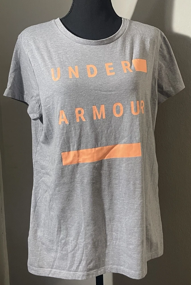 This is a women's Under Armour T-shirt in size large, featuring a solid heather gray color with a peach logo accent. The shirt has a crew neck, short sleeves, and a pullover closure. It is part of the Under Armour HeatGear product line, designed for activities like gym training, cross training, and bodybuilding. The T-shirt is made from breathable fabric, suitable for all seasons, and is machine washable for easy care. Perfect for casual wear or activewear, this modern and sporty top offers a comfortable fit for various physical activities.