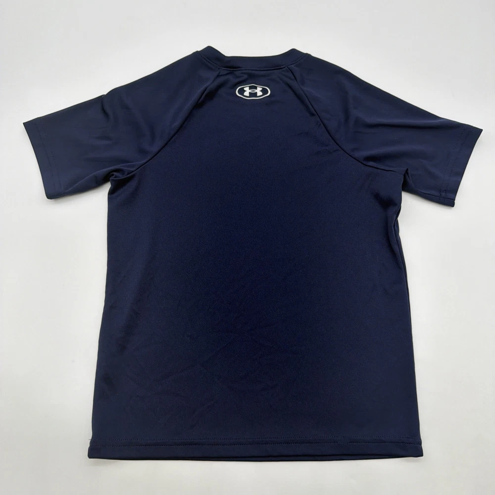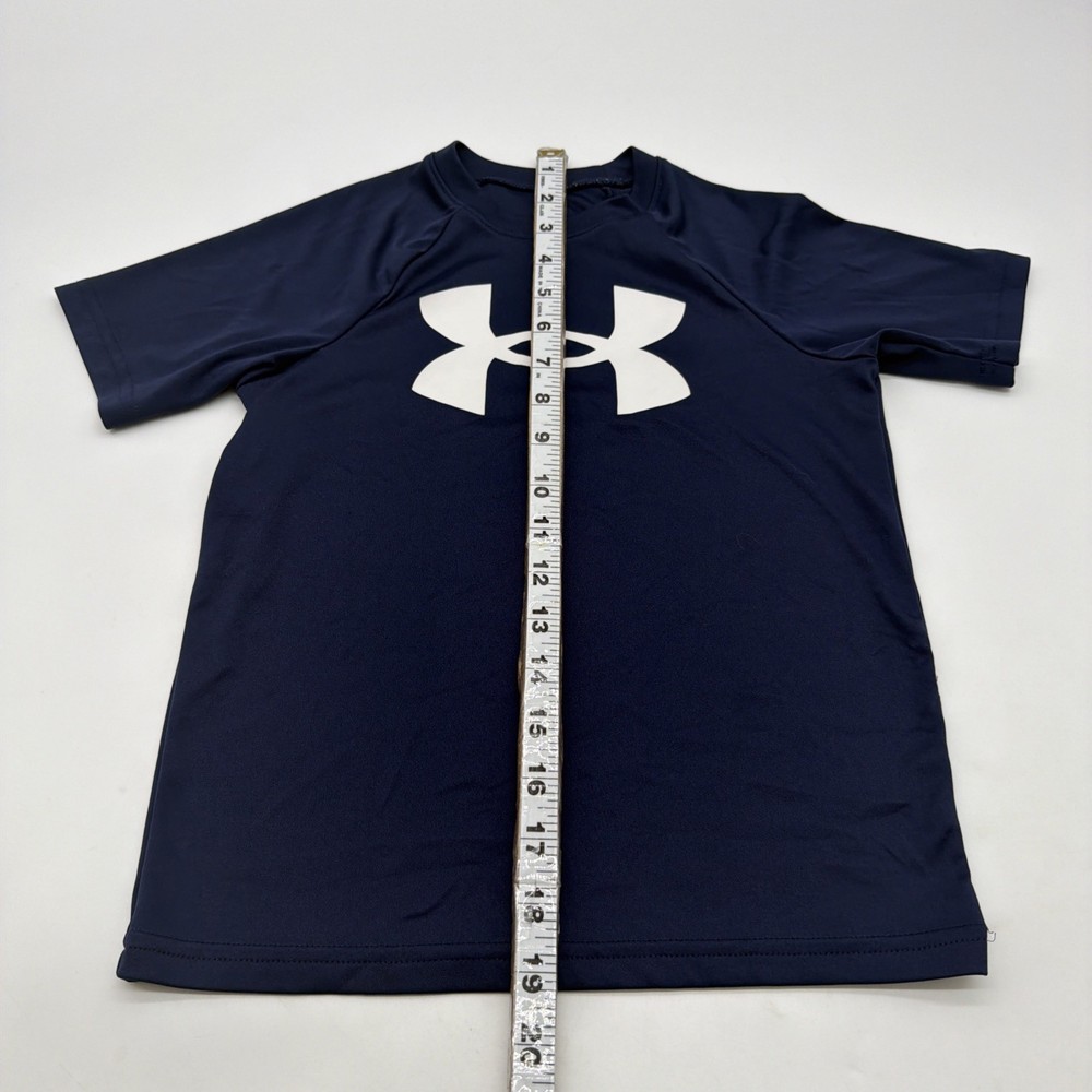 The Under Armour T-shirt Youth Boys XS Blue Graphic Print Logo is a stylish and comfortable option for young boys. Made from 100% polyester, this pullover shirt features a crew neck and short sleeves, making it perfect for various occasions such as travel, activewear, and casual outings. The blue color and graphic print logo add a vibrant and sporty touch, while the athletic fit ensures a comfortable and active feel. Whether for sports activities like basketball or simply hanging out, this T-shirt is a versatile choice for young boys. Check pictures for flaws and measurements