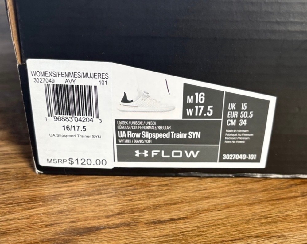 Under Armour UA Flow SlipSpeed Trainer SYN – New in Box Brand new Under Armour UA Flow SlipSpeed Trainer SYN shoes, never worn, new in original box. • Size: Men’s 16 / Women’s 17.5 • Width: Regular • Color: White / Black • Model: UA Flow SlipSpeed Trainer SYN • Closure: BOA dial system for quick, secure fit • SlipSpeed design allows easy transition between training and recovery wear • UA Flow cushioning for lightweight comfort and traction • Unisex style Perfect for training, gym workouts, walking, or everyday wear. Clean, modern look with easy on/off design. Condition: New with box (see photos) MSRP: $120