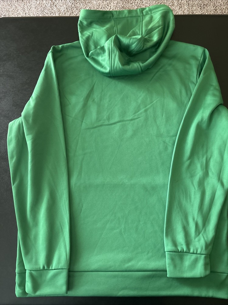 The Under Armour University of Notre Dame Fighting Irish Green Hoodie in size Large is a graphic print pullover hoodie featuring the iconic Irish logo and colors. Made from cozy fleece material, this hoodie is perfect for all seasons and activities such as gym training, walking, or football. With a crew neck, drawstring closure, and hooded style, this hoodie is both comfortable and stylish for any casual or activewear outfit. Ideal for fans of the University and those looking for quality Under Armour apparel.