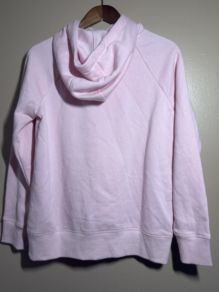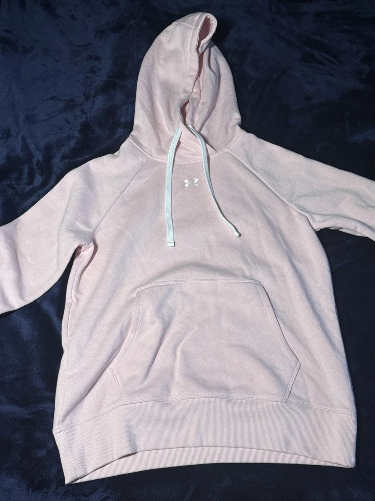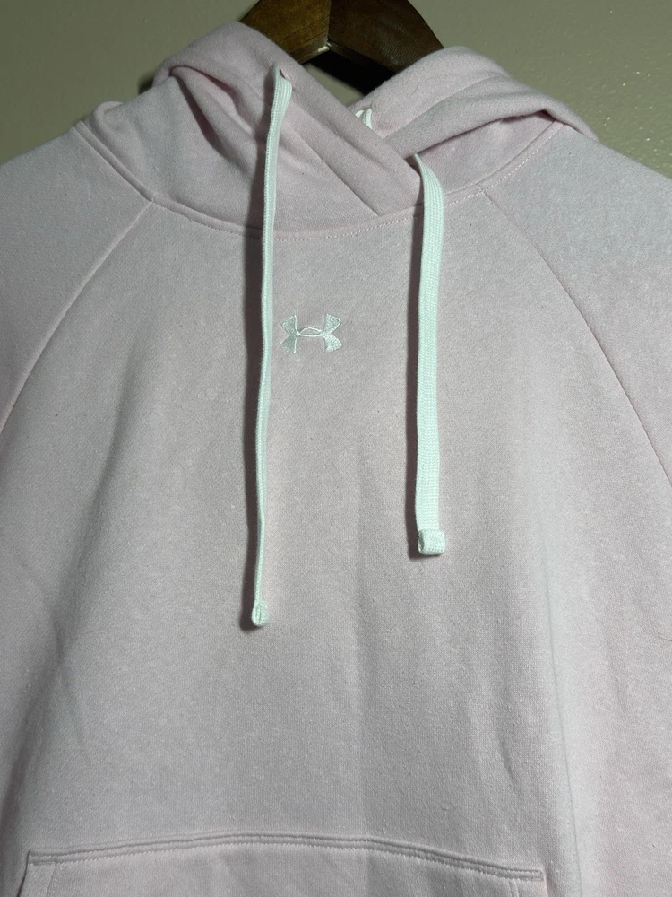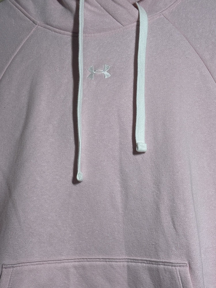 This Under Armour Women’s Light Pink Fleece Lined Hoodie in size Small offers a relaxed fit, making it ideal for a variety of activewear occasions. The hoodie features long sleeves, a drawstring closure, and a pullover style with a hood and logo accents. Made from 100% cotton knit fabric, it is machine washable and includes pockets for added convenience. Perfect for winter, fall, and spring seasons, this hoodie is ideal for activities like tennis, cycling, golf, volleyball, soccer, cross training, running, and more. The light pink color adds a feminine touch to the versatile design. *Please see images for close up* -This hoodie does have some minor lint pilling to it. I did try to use a fabric shaver to shave it down however it doesn’t seem to have worked :( Please message me with any questions!