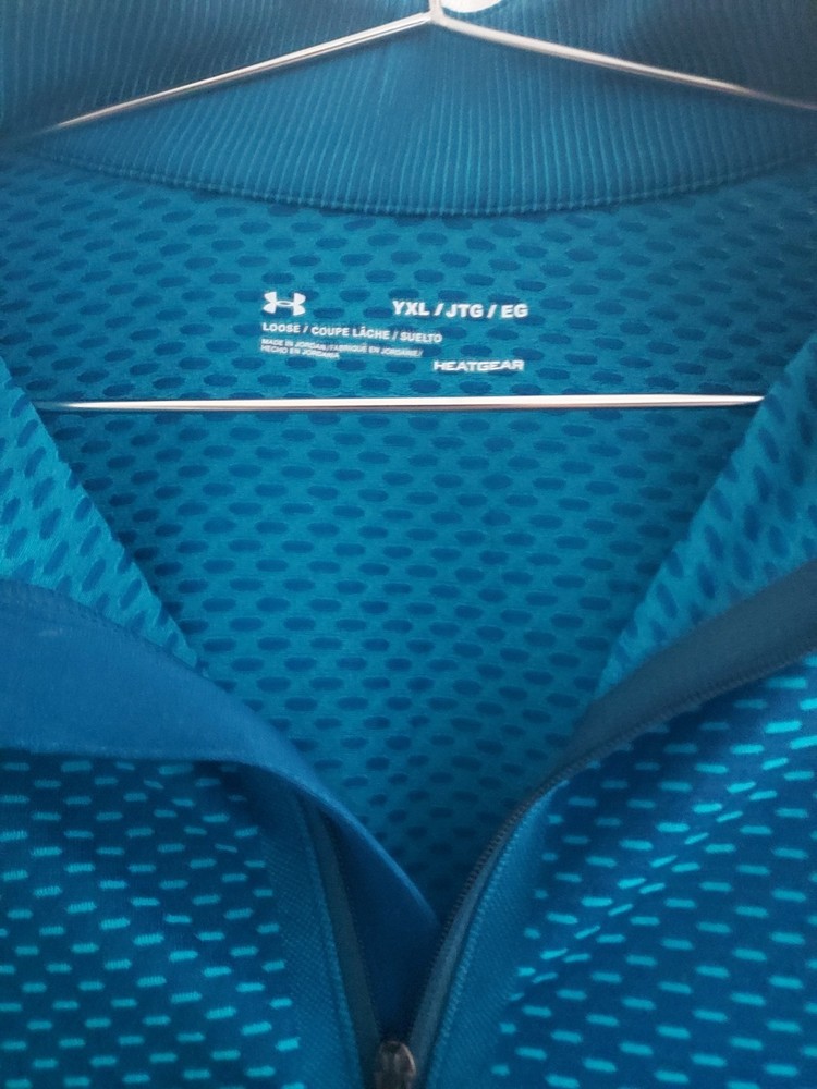 This item is a Under Armour HeatGear loose-fit shirt in youth extra-large size. It's designed with the brands' signature heat gear fabric to keep the wearer cool dry, and light by wicking away the sweat. Color: aquamarine