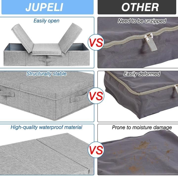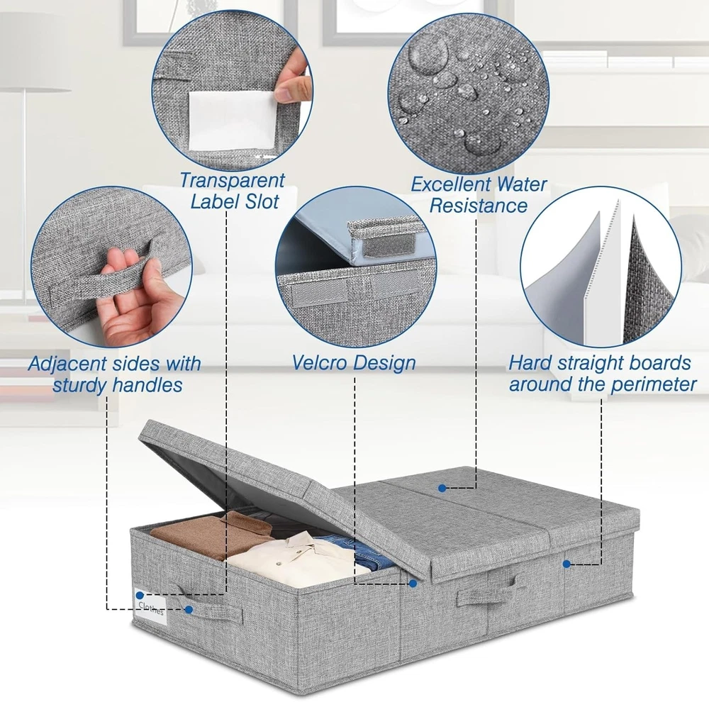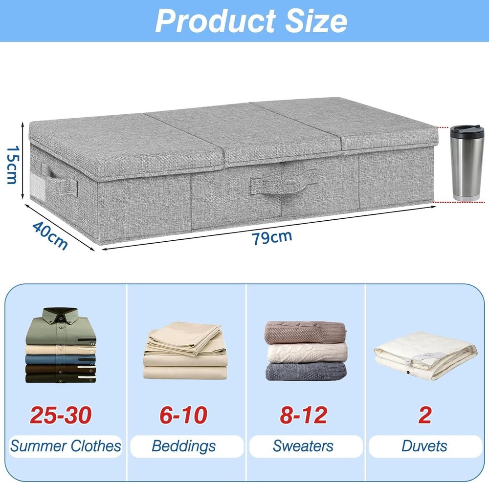 Product Features Colour Grey 2 Pack Material Fabric Special feature Stackable Style 79*40*15 About this Item 【 LARGE CAPACITY 】 : The size of each under bed storage box with lid is 79 * 40 * 15 cm. The large capacity is very suitable for storage under the cabinet, under the sofa or under the bed. The large under bed storage can store clothes, bed sheets, toys, shoes, Duvets, Comforters, Blanket, Bedding, daily necessities, etc. Free up room space and keep your room clean and tidy. 【 FOLDABLE DESIGN 】 : The clothing underbed storage boxes with lids can fold easily into three sections. When not in use, under bed storage organiser drawer containers can be folded flat in order to save space. It is also stackable and has three sturdy carry handles for quick removal and use. Our high quality material can be used many times without easy breaking and meets our family's storage needs for the last few years. 【 DURABLE PREMIUM FABRIC & HIGH-QUALITY BREATHABLE 】 : Our underbed storage organiser drawer containers are made from breathable linen fabric on the surface and Oxford cloth on the inside, which is double waterproof and dustproof. The under bed storage organiser box is made from 100% new upgraded triple laminated fabric and high quality PVC. The under bed shoe storage organiser is breathable, lightweight and stronger and more durable than traditional underbed shoe storage bags. 【 MULTI-PURPOSE STORAGE 】 : Multi-purpose under bed storage: 2 pack multiuse under bed storage drawers that can be used in the attic, basement, wardrobe, cloakroom, office, bedroom, nursery or dorm room, we can use them under the bed, under the sofa, under the cupboard or inside. For blankets and pillows, clothes, shoes, books and toys or other miscellaneous items, our under the bed storage boxes can handle all types of storage needs. 【 100% PROFECT CUSTOMER SERVICE 】 : We are committed to presenting the best quality materials and satisfaction services to our customers. If there is any problem with our products, please feel free to contact us. We will serve you as soon as possible and provide you with a satisfactory solution. We support full refund or Free replace. Description 2 Pack Foldable Under Bed Storage Box with Lids When you declutter your home with these under bed clothes storage, you enhance your life. Organise Your Home with Underbed Storage Boxes Not only does declutter reduce stress and anxiety, but it can also establish a sense of self-accomplishment, foster stronger familial relationships, and allow you to focus on what’s important instead of the mess surrounding you Under Bed Storage Box Suitable for wide range of items Winter clothes storage, blanket storage 、 Duvet storage, bedding storage 、 Shoes storage, toy storage,Any what you want Under Bed Storage Organiser Quality Details Stable and sturdy support Sturdy and durable handles Tri-fold lid with Velcro Waterproof & dustproof fabric Multiple Scenes Use The Under Bed Storage Organiser is divided into three parts, the cover, the main body, and the bottom plate. The lid can be folded into three sections and you can slide to view the contents inside. When using a large storage box, also it can be folded into a flat shape when not in use to save space Product Details Product Dimensions 79 x 40 x 15 cm; 2 kg Colour Grey 2 Pack Style 79*40*15 Material Fabric Pattern Solid Shape Rectangular Item Package Quantity 1 Number of Pieces 2 Special Features Stackable Included Components under bed storage, under bed storage box with lid, under bed storage organiser, underbed storage, underbed storage boxes with lids Batteries included? No Batteries Required? No Item Weight 2 kg
