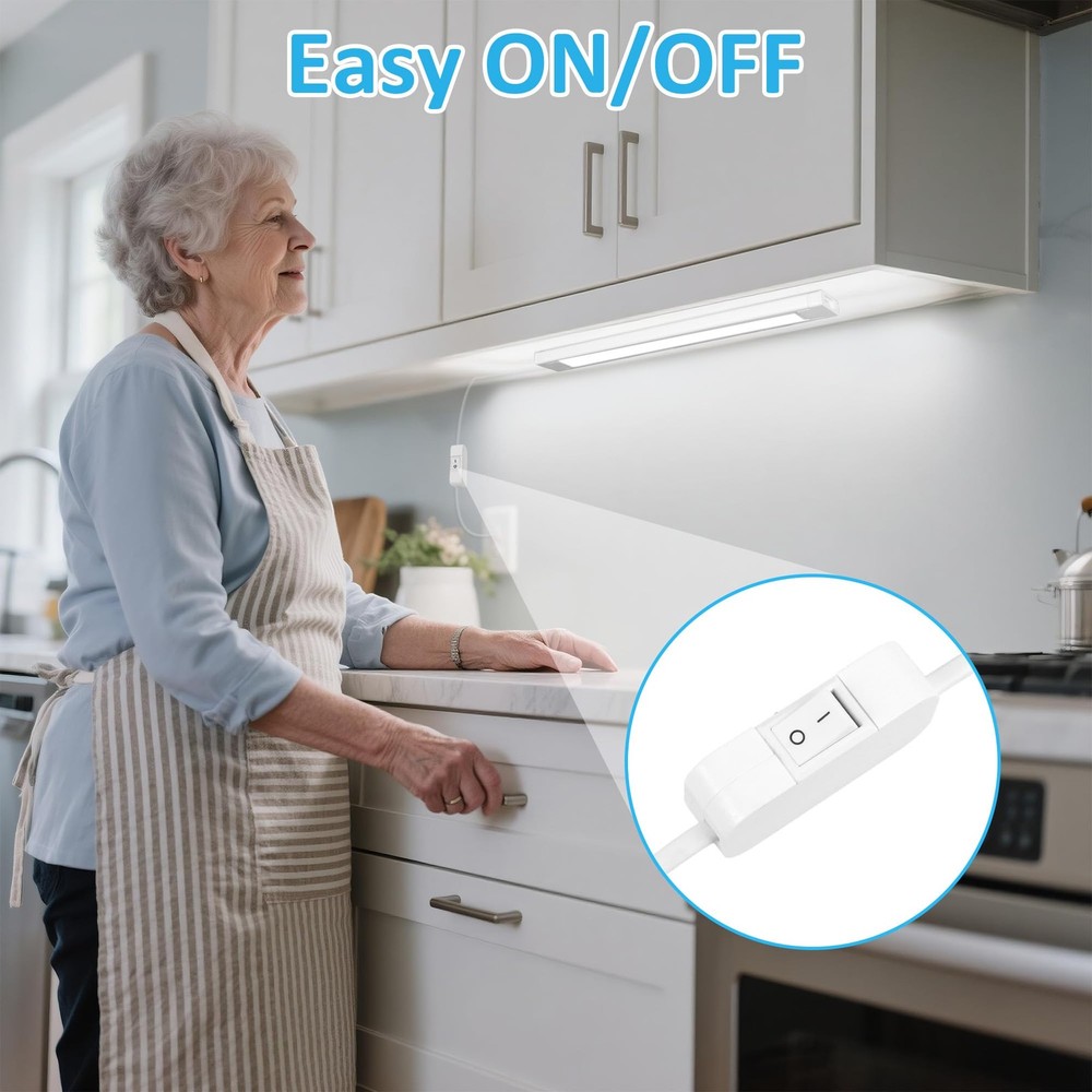 Under Cabinet Lighting Plug in 1 Pack Ultra Bright & Energy Saving: Provide powerful 6000K daylight brightness with low energy consumption, these under cabinet lights plug in are perfect for kitchen counters, closets, workbench, and office desk. LED design ensures long lifespan and saves up to 85% energy compared to traditional lighting Easy ON/OFF Switch Design: Equipped with a convenient inline switch, these cabinet lights with plug allow you to turn on/off instantly without bending or complicated controls. Ideal for seniors, families, and daily kitchen lighting needs Two Connection Methods – Flexible Installation: Linkable design supports two ways to connect: use the 4.9ft connection cable for wider spacing or the direct connector for seamless installation. Easily extend multiple LED under counter lights to cover a large area Two Mounting Options – Adhesive or Screws: Comes with strong adhesive pads and mounting clips with screws, giving you two simple installation methods for under cabinet lighting. No need for electricians, install in minutes under cabinet, shelf, or workbench Versatile Applications – Kitchen, Workbench & Office: This linkable under cabinet light bar kit is not only perfect for kitchen cabinet lighting, but also great for workbench, office desk, laundry room, or reading space. Slim design hides easily while providing bright and even illumination