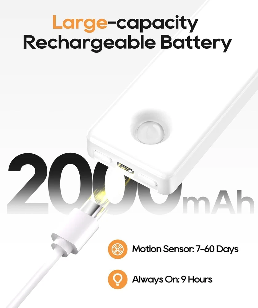 Smart Motion Sensing Technology: With a 10-foot, 120-degree sensing range, our motion sensor light indoor activates upon detecting movement, providing hands-free convenience. After 20 seconds of no motion, it automatically switches off to conserve energy. Eye-Care Gradual Brightening: Our under cabinet lights gradually brighten to avoid sudden glare, providing gentle illumination that safeguards your eyes. 36 Straight-Emitting LEDs: Compared to side-emitting, our under counter lights for kitchen offer higher luminous efficiency and greater energy savings, ensuring superior brightness while consuming less power. Long-lasting Illumination: Featuring a high-capacity battery, our rechargeable battery operated lights offer up to 60 days of continuous use in sensor mode, addressing your need for lighting without frequent charging. 4 Lighting Modes: Choose from four versatile modes: always on, day, night, and off. Day mode activates when motion sensed in all light conditions, night mode activates when motion sensed in low light conditions, ensuring energy efficiency and light only when you need it. Adjustable Brightness Levels: According to your preference, tap for 4-level dimming from 25%, 50%, 75%, or 100% brightness options, long press for seamless dimming adjustment, providing the perfect under cabinet lighting for any occasion. Effortless Installation: Equipped with built-in magnets and additional adhesive metal plates, our step lights can be easily mounted on any surface with no tools required. Enjoy enhanced lighting in minutes wherever you need illumination. Versatile Application: Perfect for under cabinet lighting wireless in kitchens, wardrobes, bedrooms, stairwells or hallways, enhancing every corner of your home. Sleek, Ultra-Thin Design: Our latest generation led lights for bedroom features a full-screen, ultra-thin design at just 0.39 inches thick, blending seamlessly into your home decor. Product Description Motion Sensor Under Cabinet Lights Add to Cart Add to Cart Add to Cart Add to Cart Add to Cart Customer Reviews 4.5 out of 5 stars 2,844 4.5 out of 5 stars 2,844 4.5 out of 5 stars 2,844 4.5 out of 5 stars 206 4.5 out of 5 stars 206 Price $9.49 $ 9 . 49 $14.98 $ 14 . 98 $19.98 $ 19 . 98 $17.98 $ 17 . 98 $23.99 $ 23 . 99 Length 8 inch 8 inch 12.7 inch 8 inch 12.7 inch Light Color Bright White Soft White Soft White 3 Color Temperatures 3 Color Temperatures Brightness 105 Lumen 100 Lumen 162 Lumen 100 Lumen 162 Lumen Light Sources 36 LED 31 LED 56 LED 62 LED 112 LED Battery Capacity 2000mAh 2200mAh 3200mAh 2200mAh 3200mAh Power Source Rechargeable Rechargeable Rechargeable Rechargeable Rechargeable Mounting Type Wireless Wireless Wireless Wireless Wireless