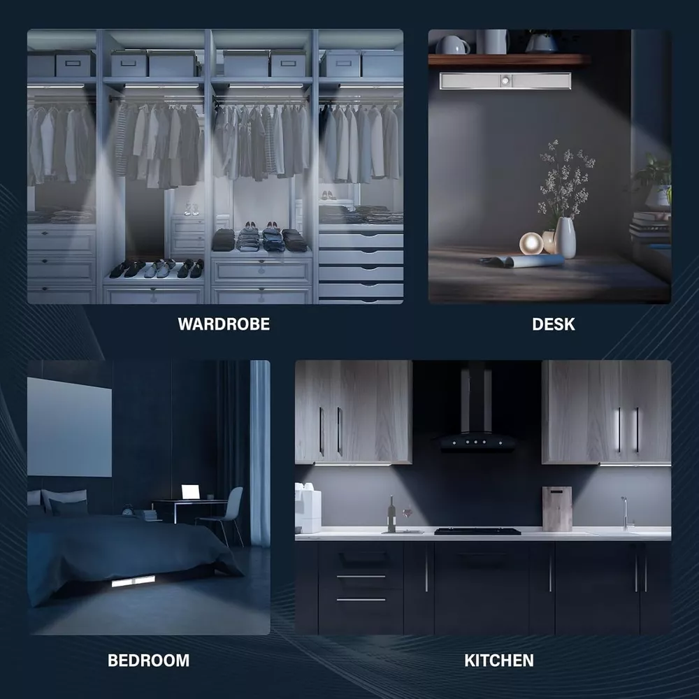 BRAND NEW Soft and Bright Light: With LED lamp beads and a diffuse light design, our 12 inch Cabinet Lights produce softer, brighter, and more uniform light Wide Sensing Range: Our Cabinet Lights feature a high-sensitivity motion sensor that can detect all objects within 10 feet and 120° from the center of the sensor. Any minor movement will immediately turn on the lights, making them convenient and energy-efficient Multiple Sensing Modes: To suit different scenarios, we offer two sensing modes: auto mode, lighting mode Please read the instructions carefully before use to ensure optimal performance. At the same time, we equipped the cabinet lights with the latest type-C charging interface Long-Lasting Battery: Our Cabinet Lights have a large battery capacity that can continuously light up for up to 6 hours on the highest brightness settings. They can also be used for over two months in induction mode, making them ideal for long-term use Non-destructive installation: Our Cabinet Lights can be attached to any steel metal surface. You can also install them anywhere you want using the included metal sheet, without damaging your cabinets or walls
