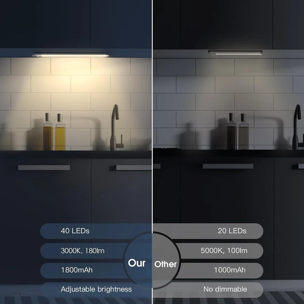 Upgraded Motion Sensor Under Cabinet Lights: Setting the under cabinet lights on motion sensor mode, they auto-on when human motion is detected within 120°and 10ft in a dark or low light environment, and auto-off after about 20 seconds of no motion detected. No longer have to worry about tripping on the step in the dark trying to turn on the switch Upgraded Dimmable Closet Lights: The cabinet lights are bright and eye-protection, thanks to 40pcs energy-saving LEDs and a non-glare frosted cover. In addition, unlike fixed brightness of others', our motion sensor light indoor has 5 levels of brightness. So the dimmable under cabinet lighting allows you to brighten them for task like meal preparation and dim them for a motion sensor night light without waking other people up at midnight Always-on Mode: The under counter lights for kitchen can be also be set to be always-on, or off. The always-on feature allows you use the motion sensor lights on daytime for a long time task. It can be used in reading, camping and as a flashlight USB-C Rechargeable Under Cabinet Lights Wireless: These under cabinet lights built-in a 1800mAh rechargeable battery and can be easily recharged via type-C cable. Don’t worry about wiring, available outlets or battery replacement like other styles. One full charge can last up to 7-30 days on Motion Sensor Mode(depends on how often you use) and 8 hours on Always-on Mode at 100% brightness. Note that the USB wall adapter is not included Easy Installation & Wide Usage: With built-in strong magnets, these closet lights are easy to install, no need for an electrician. It can be adsorbed directly on ironwork surfaces. Or use the included adhesive metal plates to stick on anywhere you want. That also means it’s easy to take off and put back on when it needs a charge. Great under counter lights for kitchen, clooset, cupboard, pantry, basement, stairs, hallway, bookshelf, etc Product Description Are you in pain of stumbling around to find the light switch in the dark? Are you looking for some lights to brighten up your cabinet, dark pantry and closet where an electric outlet is not available? If so, convenient rechargeable motion sensor closet lights will be a smart solution. MCGOR Wireless Motion Sensor Under Cabinet Lights will turn on automatically when you close to cabinet and closet and eliminate dangling cords or unsightly plugs. Bring great convenience to your life. What Makes MCGOR Motion Sensor Light Indoor Unique? ✔️40 LED: The under cabinet lighting includes 40 LED beads which emit 180 lumens of soft, diffused white light. Provide sufficient light to illuminate every dark corner. ✔️ Three Modes: Alway-on mode, Motion sensor mode, Turn off mode. Always On Mode: The cabinet light will provide spotlighting wherever and whenever you need it. You can use it on daytime or night Motion Sensor Mode: The motion sensor night light will auto-on when human motion is detected within 120°and 10ft, and auto-off after about 20 seconds of no motion detected. No longer have to worry about tripping on the step in the dark trying to turn on the switch. NOTE: This feature only works in a dark or low light. ✔️ Adjustable Brightness: 10%, 25%,50%, 75%, 100% settings, or long press button to stepless dimming, meet different lighting needs. ✔️ Rechargeable Battery: Built-in 1800 mAh rechargeable battery and convenient usb-c charging port. No battery replacement. No wiring or drilling. ✔️ Easier to Install Than A Light Socket: 2 installation ways: via built-in magnets or adhesive metal plates, you can mount these under cabinet lights wireless in ironwork surface and other clean and flat surfaces. Wide application The motion sensor night light is ideal for use in cabinet, closet, wardrobe, cupboard, bathroom, corridors, hallway, stairs, basements, pantry and baby room among other places. 2 x Motion Sensor Closet Light 2 x USB Cable 6 x Adhesive iron plate 1 x User Manual If you have any question, please tell us, we will provide professional service to solve all your problems.