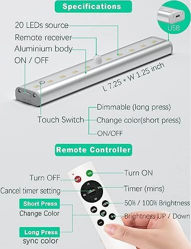 Item Weight: 1.32 pounds Assembly Required: No Item Length: 1 Lighting Method: Downlight Power Source: Battery Powered Item Width: 1 Shade Color: White EAN: Does Not Apply Included Components: Rechargeable Batteries included, 4 USB cables, 4 cabinet lights, Shape: Straight Light Source Type: LED Indoor Outdoor Usage: Indoor MPN: Does Not Apply Color: Rechargeable / 4 Pack gtin13: Does Not Apply Specific Uses For Product: Indoor use only, Under cabinet lights, Under cabinet lighting, LE UPC: Does Not Apply Shade Material: Iron, Shell Country of Origin: China Special Feature: timer, rechargeable, remote control, Cordless, dimmable Unit Count: 4.0 Count Brand: Does Not Apply Switch Type: Touch Number of Items: 4 Brightness: 140 Lumen Controller Type: Remote Control Type: Does Not Apply Light Color: warm white, cool white Room Type: Kitchen, Bathroom, Bedroom, Living Room, home office kids Theme: Space Voltage: 5 Volts (DC) Model Name: 8124 Number of Light Sources: 20 Installation Type: Flush Mount Product Dimensions: 7.5"L x 1.5"W x 0.5"H Wattage: 2 watts Item Height: 1 Control Method: Remote Fixture Type: Non Removable Manufacturer: Does Not Apply Material: Aluminum Light fixture form: Sconce Mounting Type: Wall Mount Style: Rechargeable / 4 Pack