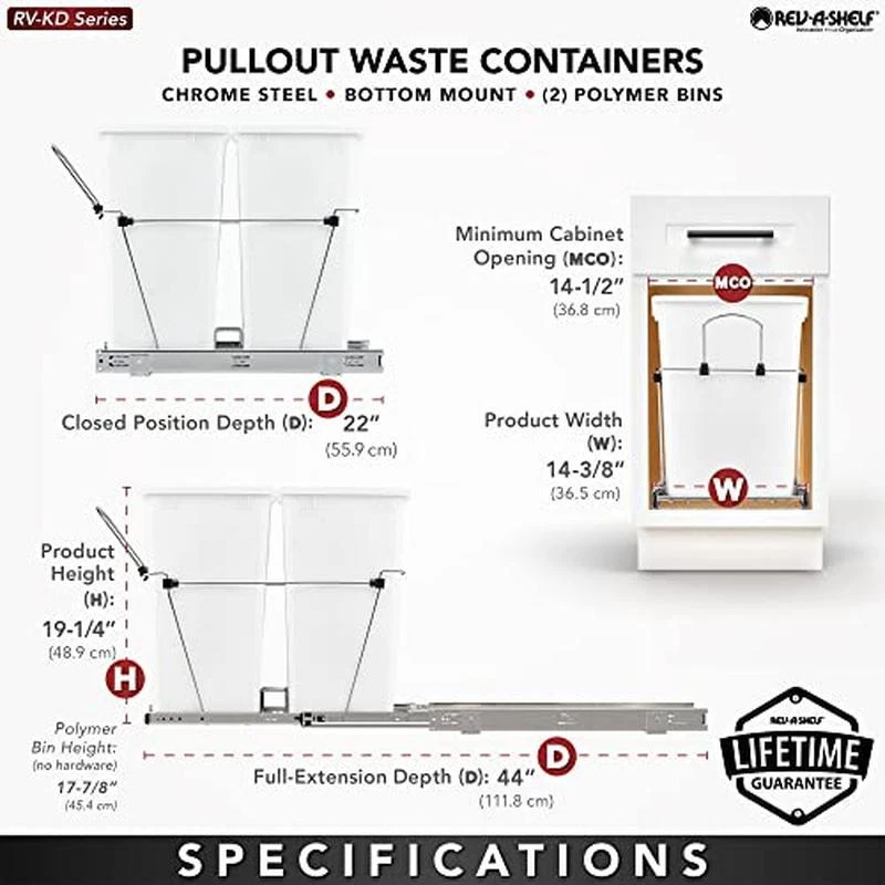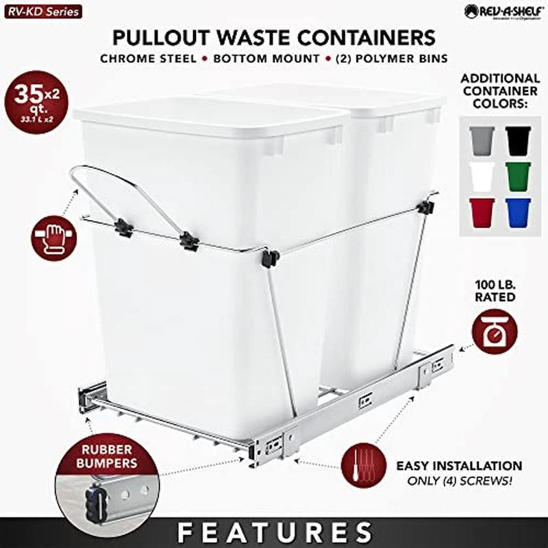 You may also like 5-Tier Steel Wire Shelving Unit W/ Wheels Heavy-Duty Storage Kitchen Garage New 88.78 USD 93.45 USD Free shipping 5% off 2 Tier Kidney Lazy Susan Organizer Corner Cabinet Plastic Swivel Storage New 71.21 USD 74.96 USD Free shipping 5% off Soft Velvet Pillow Cover W/ Pompoms Hidden Zipper Decorative Throw Cushion New 19.82 USD 20.86 USD Free shipping 5% off 5ft Portable Folding Event Table Indoor Outdoor Banquet Seating Heavy Duty New 93.75 USD 98.68 USD Free shipping 5% off 50 Channel GMRS Long Range Walkie Talkies Weather Alert Two Way Radio Set New 74.8 USD 78.74 USD Free shipping 5% off Portable Folding Walker W/ 5in Wheels Adjustable Height Storage Pouches New 56.09 USD 59.04 USD Free shipping 5% off Electric Meat Slicer Adjustable Thickness Deli Food Cutting Machine Easy Clean 117.7 USD 123.89 USD Free shipping 5% off Extra Absorbent Utility Towels General Purpose Cleaning Wipes 1008 Sheets Total 82.5 USD 86.84 USD Free shipping 5% off 12-Pack Plastic Laundry Baskets 1.5 Bushel Hamper Easy Carry Ventilated Durable 54.65 USD 57.53 USD Free shipping 5% off Fall Pumpkin Gourd Berries Pinecones Arrangement Natural Vase Tabletop Decor New 26.49 USD 27.88 USD Free shipping 5% off Handmade Moroccan Cooking Tagine Lead Free Clay Pot Ideal Stovetop Oven New 69.64 USD 73.31 USD Free shipping 5% off Flip Top Bench Table Patio Seating Durable Customize Expandable Space Saver New 79.41 USD 83.59 USD Free shipping 5% off About this item Convenient Pullout Waste Container: Keep your kitchen waste and recycling container hidden but easily accessible with this single 35-quart pullout waste bin from Pullout Waste Container Specs: Dimensions: 14. 21"W x 22"D x 19. 25"H; Weight: 13. 5 pounds; Made from a durable, steel construction and designed to fit any base cabinets with a 14. 5" or larger opening Efficient Pullout Trash Cabinet: Features a sturdy heavy-duty ball-bearing slide system that extends fully and can support up to 100 pounds of trash, waste, and recyclable materials Easy to Install Trash Bin: Package includes (2) black 35-quart containers, chrome frame, and mounting hardware; Optional door mount kit (5WB-DMKIT) and lids are sold separately Capacity 70 Quarts Color Black Opening Mechanism Pull-Out Material Steel Recommended Uses For Product Trash or waste Room Type Kitchen You may also like Lightweight Black Poster Frame 27x40 Art Print Vertical Horizontal Display New 21.62 USD 22.76 USD Free shipping 5% off Automotive Aircraft Remover Fast Acting Paint Stripper Quart Metal Finish New 35.66 USD 37.54 USD Free shipping 5% off 32 Piece Combination Wrench Set Metric SAE Durable Chrome Vanadium Storage Case 27.13 USD 28.56 USD Free shipping 5% off Clear Flared Red Wine Glasses Set of 4 Premium 17oz Durable Dishwasher Safe New 17.97 USD 18.92 USD Free shipping 5% off 5lb Powder Deer Attractant Sweet Savory Aroma High Volume Feeding Supplement New 15.7 USD 16.53 USD Free shipping 5% off 16 Piece Non-Stick Ceramic Cookware Set Heat Resistant Tools Dishwasher Safe New 72.87 USD 76.7 USD Free shipping 5% off Natural Shrimp Treat Freshwater Saltwater Fish Protein Rich Supplement New 17.04 USD 17.94 USD Free shipping 5% off Manual Sausage Stuffer 1.5L Vertical Stainless Steel Food Grade Machine New 66.68 USD 70.19 USD Free shipping 5% off 16% Layer Pellets Chicken Feed 40lb Natural Complete Nutrition Healthy Eggs New 22.3 USD 23.47 USD Free shipping 5% off Clear Plastic Storage Box Stackable Organizer 41Qt Snap Lid Household Use 17.83 USD 18.77 USD Free shipping 5% off Ultra Fresh Flushable Wipes 100% Flushable Adult Wipes Septic Safe 168 Count New 14.04 USD 14.78 USD Free shipping 5% off 18-Pack Soft Cotton Washcloths Set Absorbent Durable Quick Dry Multi Purpose New 10.43 USD 10.98 USD Free shipping 5% off