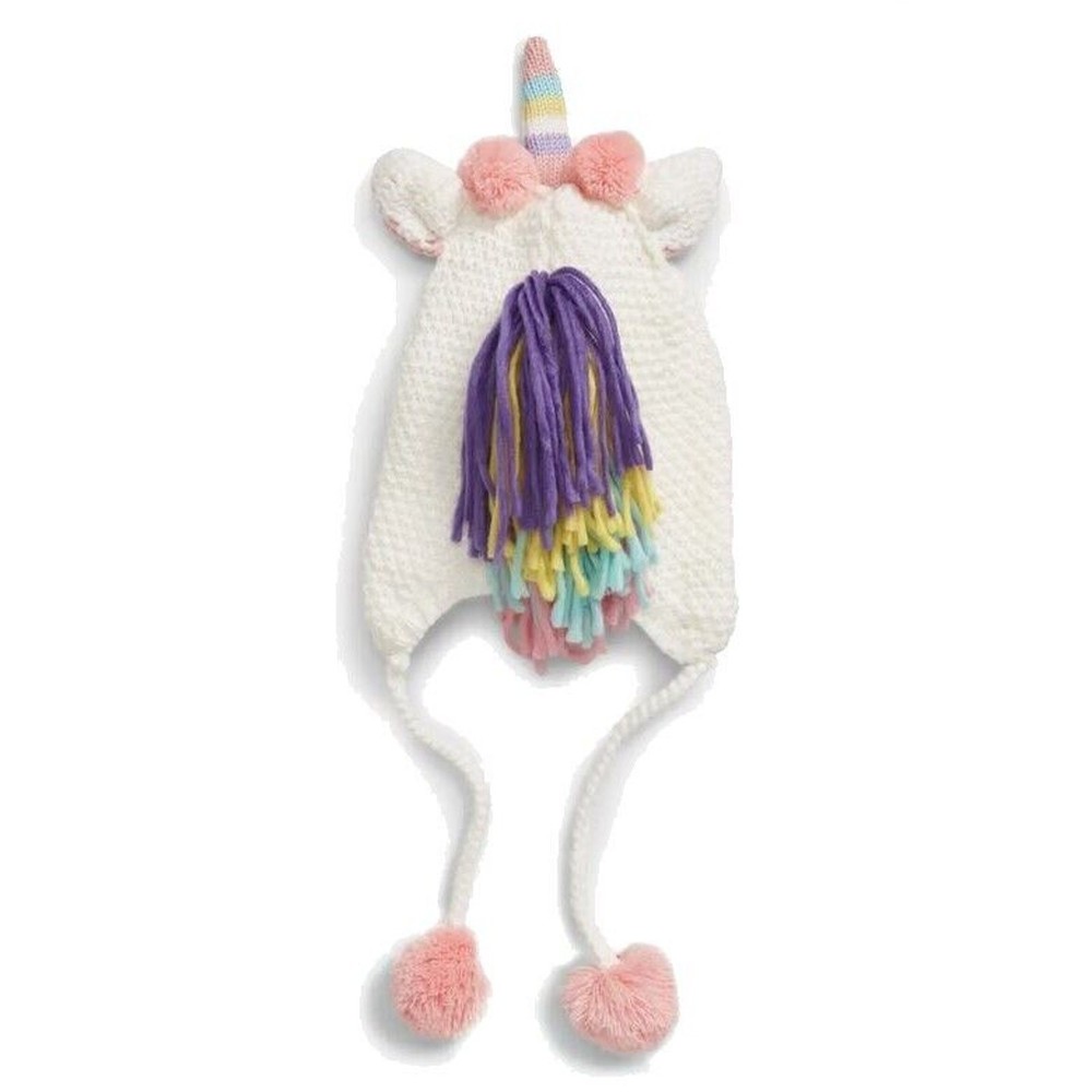 Under One Sky Girl Cable Knit White Unicorn Fleece Lined Earflap Hat Size S/1-3Y New with tags Whimsical unicorn hat featuring cozy ear flaps, pompom ties and a colorful tassel mane. 100% acrylic Soft fleece lining Hand wash, line dry Age 1-3 years