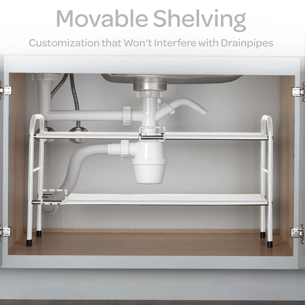 The completely customizable 2-Tier Under Kitchen Sink Organizer by turns wasted space into organized storage. With an adjustable length and 8 removable shelf panels, this bathroom cabinet organizer allows for customizable and movable shelving, so interfering with drainpipes isn’t an issue. This cabinet shelf fits under almost any sink or cupboard and is perfect for organizing cleaning products, toiletries, towels, or for creating more space for pots and pans. UNDER THE SINK ORGANIZER - Transform wasted storage space with the under bathroom sink organizers and storage. This under cabinet shelf allows you to increase your kitchen or bathroom storage options by fully utilizing the space under your sink. ADJUSTABLE DESIGN - With an adjustable length from 20.5in to 27.5in and 8 removable shelf panels, the under cabinet organizer fits under almost any sink. The panels allow for completely customizable and movable shelving, so drainpipes aren't an issue. DURABLE CONSTRUCTION - Made of stainless steel and heavy duty plastic, each shelf on this under bathroom sink organizer can support up to 16.5lbs when contracted and 11lbs when extended. The cabinet shelves assemble quickly with hardware included. VERSATILE USE - Use the unit as a kitchen shelf organizer to pots, pans and dishes, or use it as a bathroom sink organizer to cleaning supplies or toiletries, ideal for adding usable under shelf storage space to any sink, cabinet, or cupboard. PRODUCT DETAILS - Materials: Stainless Steel and Plastic. Dimensions: (L) 20.5-27.5” x (W) 9.8” x (H) 16.5”; Panels: (L) 6.5” x (W) 10”. Product Weight: 4lbs. Weight Capacity: When Contracted: 16.5lbs Per Shelf; Expanded: 11lbs Per Shelf. Color: White.