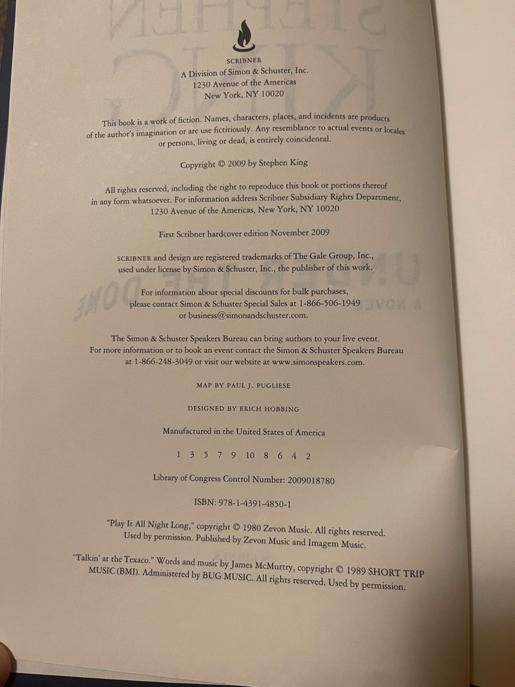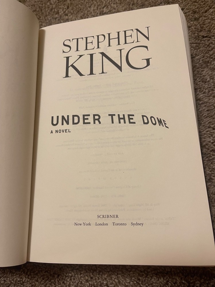 Publisher: Scribner Genre: Fiction Item Weight: 58.9 Oz Edition: First Edition Format: Hardcover Publication Year: 2009 Book Title: Under the Dome : a Novel Item Width: 6.5in. Type: Novel Item Length: 9.5in. Author: Stephen King Era: 2000s Signed: No Features: Dust Jacket Item Height: 2.5in. Topic: Psychological, Horror, Thrillers / Suspense, General Language: English Original Language: English Country of Origin: United States Number of Pages: 1074 Pages Intended Audience: Adults
