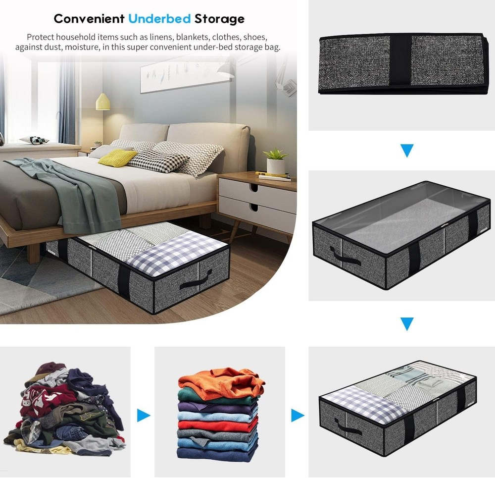 Underbed Fabric Storage Bags Organizer with 4 Handles, 2 Zippers and Large Clear Window, for Clothes, Blankets, Bedding, Foldable with Sturdy Structure, 2 Pack, Linen-like Black, MXAUBBSS2P STORAGE FOR MULTIPURPOSE - This underbed storage bag fits perfectly under your bed. And ideal for storing clothes, comforters, blankets, off season duvets, beddings, pillows, garments, sweaters, and so on. Keep your closet tidy and clean. COMPLETELY BREATHABLE and 100% ECO-FRIENDLY - This storage bag is made of breathable nonwoven fabric that allows air to circulate inside, ultimately keeping stored items fresh for longer, lightweight, eco-friendly. The sturdy side walls with inserts can hold shape without being filled up. CONSIDERATE DESIGN - With the help of top transparent window, you will find what inside easily and quickly. This storage bag has 5# larger metal zippers, they can be used more than 1000 times (more times than others' cheap bags). Dimension: 86x50x15cm( FOUR DURABLE HANDLES - The 2 front handles are 5 cm wide and the 2 side handles are sewn to 2 layer high quality fabric, more durable to carry and pull out from under the bed. You can also fold this storage bag flat to save space when not in use. product: - THE BEST CUSTOMER SERVICE - If for any reason you're not completely happy with your purchase - if it breaks, if it's damaged in shipping, or even if you change your mind - simply let us know and we will either replace it or satisfaction your money, your choice!