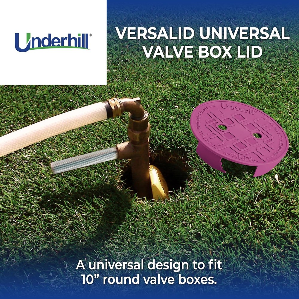 Underhill Sprinkler Valve Round Box Lid, VersaLid 10 10 Inch, Purple - 1 Pack Description Features: UNIVERSAL SPRINKLER BOX LID – The Underhill VersaLid fits round valve boxes for residential and commercial sprinkler systems. COMPATIBILITY – The universal fit irrigation valve box cover fits 10-inch round boxes. Purple lid cover for non-portable/reclaimed (non-drinking) water. DURABLE – Round water irrigation cover made from high quality and durable materials. The yard sprinkler system valve box cover features an increased top-load strength and it’s more sun resistant than structural foam lids. REPLACEMENT PART – A certified replacement part for the sprinkler valve box on water sprinkler systems. The ideal solution for missing or broken valve box lids. PROFESSIONAL QUALITY – Designed for everyday use and made from premium materials. The sprinkler valve cover is ideal for professional applications by irrigation specialists or for home use. Product Details: Brand: Underhill Color: Purple - 1 Pack Material: Plastic Style: Compact Manufacturer: Underhill Number of Items: 1 Package Dimensions: 9.96 x 9.8 x 2.24 inches Item Weight: 12 ounces Item model number: VL-10P Handling We will ship all orders within 1 business day of payment. Delivery We Do Not Ship Outside of the Continental US. Return Policy All items qualify for returns within 30 days of receipt. Buyer is responsible for return shipping on any item that is not damaged. Feedback We take our reputation seriously, we buy and sell online, so we understand the value of trust. If you are unsatisfied with your order, please contact us and we will work with you to resolve it to your satisfaction.