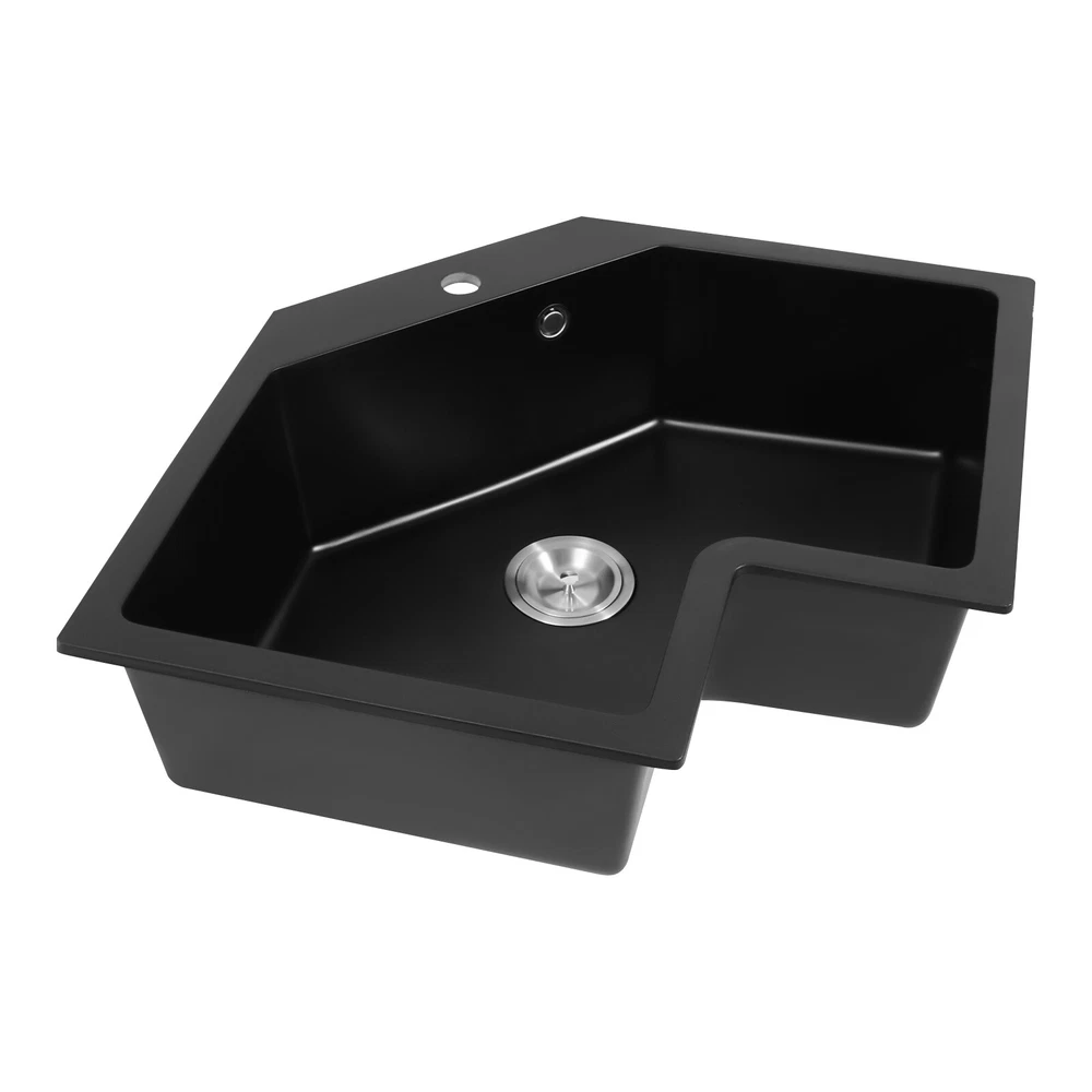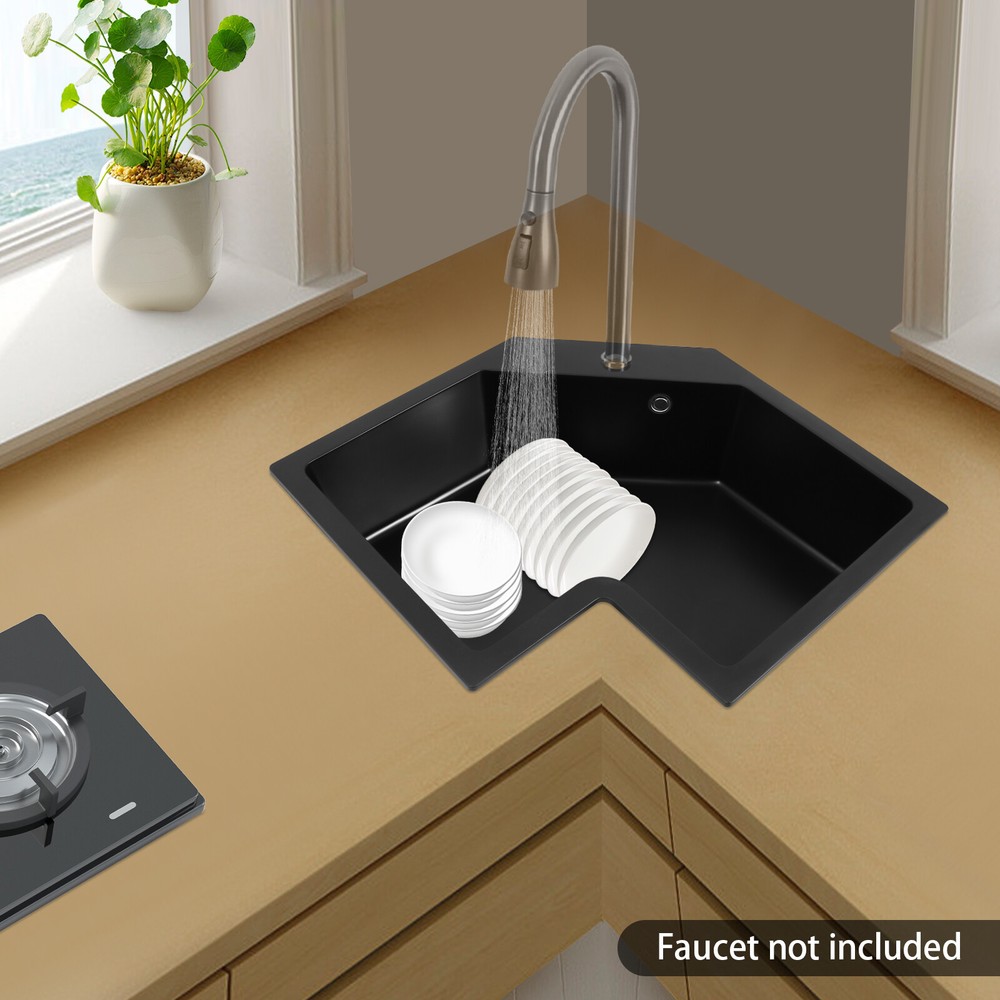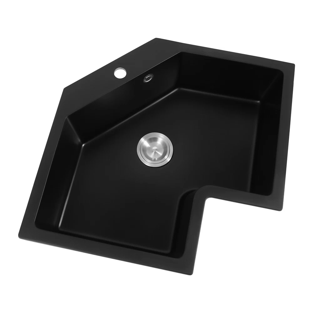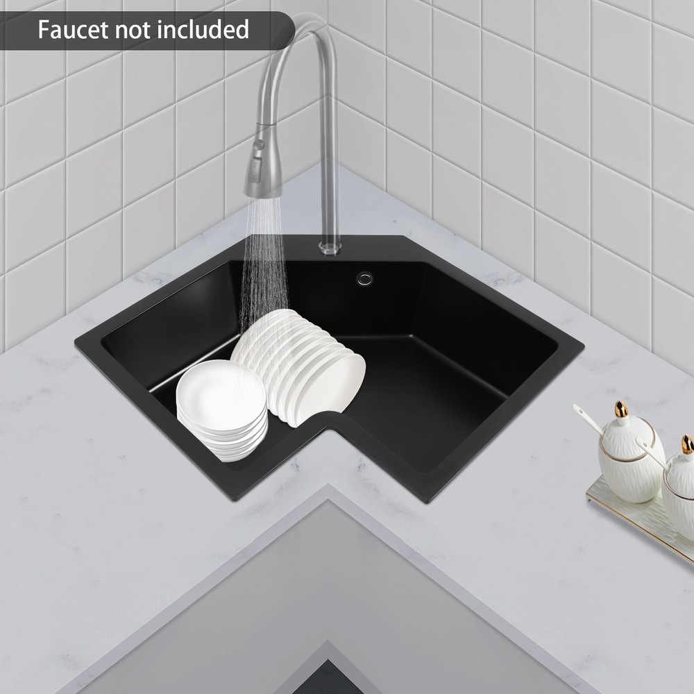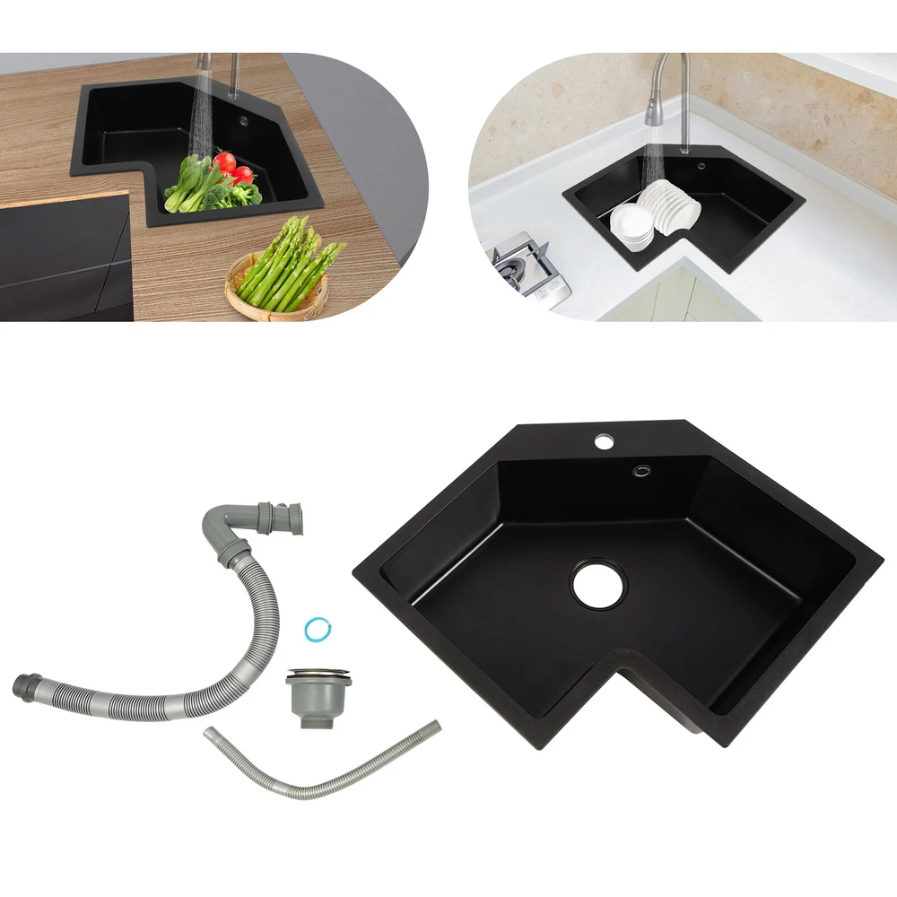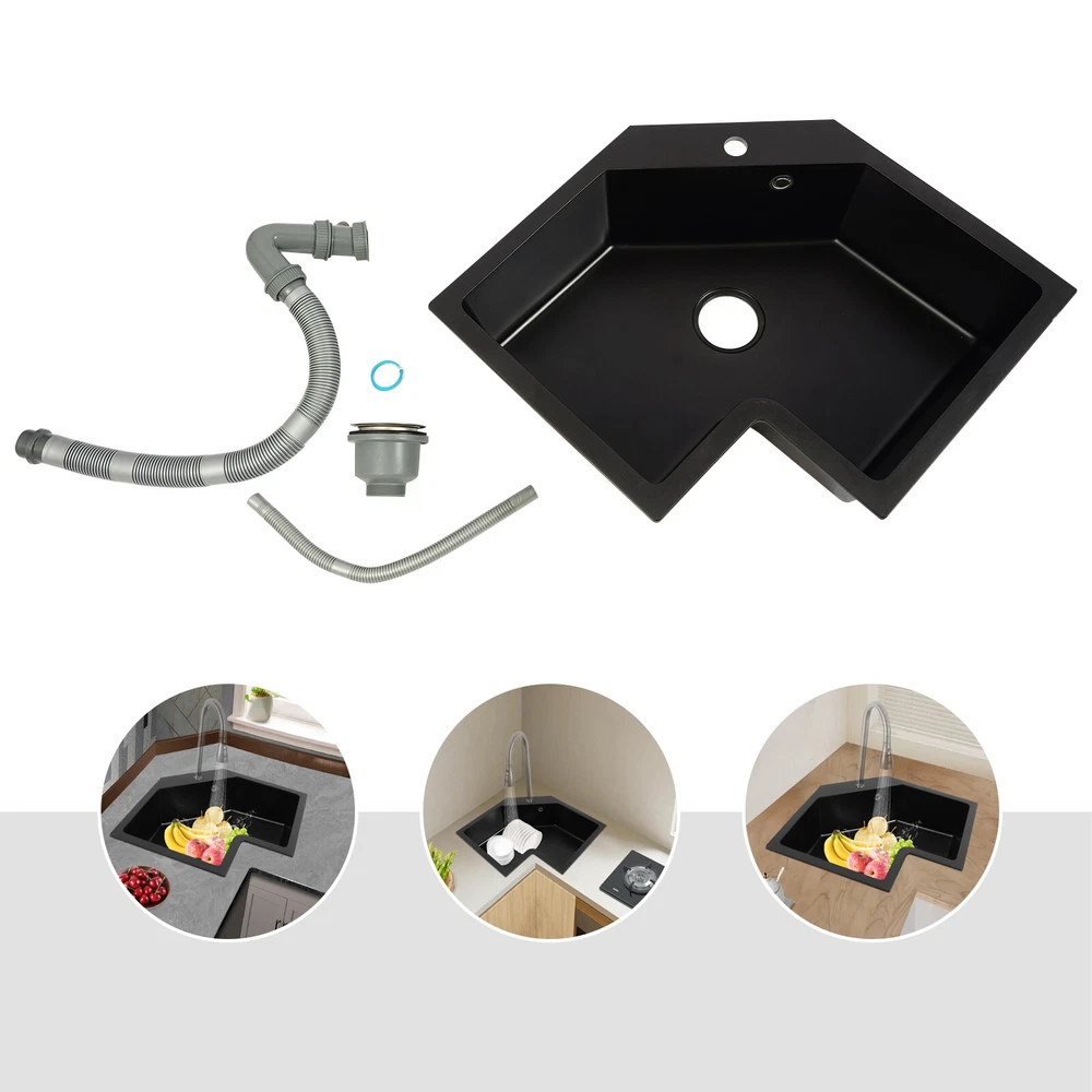 Undermount Flushmount Corner Kitchen Sink Irregular Kitchen Sink w/ Strainer Description This corner kitchen sink is made of high-class materials and adopts excellent workmanship, making it sturdy and corrosion-resistant. Its enlarged and deepened sink not only reduces water splashing but also increases the space for cleaning a lot of cookware. With it, you can enjoy a more convenient life. Don't hesitate, upgrade your kitchen and embrace future life! Key Features Build to Last: It is made of high-class quartz and rubber, so it has good corrosion resistance, oxidation resistance, and impact resistance. It can be used in wet environments such as the kitchen and laundry room. Large Capacity: The deep sink (depth: 8.27") can hold a large amount of dishes, making you more comfortable and efficient when washing. It is a great helper for you to clean dishes or prepare food. Enhanced Load-bearing Capacity: The sink is made of thickened (bottom thickness: 12mm, side thickness: 0.8mm) and reinforced quartz, which can withstand 220.46 lbs weight so you can use it with confidence. Good Sealing Performance: The rubber sealing rings can make the connection tighter, effectively reducing water leakage and saving you costs. Excellent Odor-resistance Performance: The drainage strainer intercepts food and debris for easy disposal and prevents clogging. The specially designed drain pipe drains faster, so you don't have to worry about being troubled by the unpleasant smell. Thoughtful Design: The drainpipe can be freely bent, depending on the installation position, reducing use restrictions. Maximize Space Utilization: It can fit into the corner of your kitchen countertop, utilizing the often underutilized corner space, enhancing your cooking experience, and making your kitchen more organized and efficient. Modern Appearance: With its unique irregular geometric shape, low-ley black color, and smooth lines, it can easily integrate into the kitchen space, showing an aesthetic that is both modern and elegant. Easy to Install: Its simple structure and complete accessories allow you to easily complete the installation in a short time. In addition, 2 different mounting ways (undermount, flushmount) can meet your different needs. Easy to Clean : The smooth surface, simple construction, and rounded corner design that does not easily harbor dirt make the sink easy to rinse with clean water. Buy with Confidence: We stand behind all our guests and look forward to assisting you with your purchase. It is our pleasure to answer your confusion and questions. The end of the story between us is not "we sell and you buy". Details Anti-overflow Hole: It can reduce the risk of overflowing water. Even if you forget to turn off the water, you don't have to worry. Rounded Corners and Edges: The corners are rounded and smooth to reduce abrasions from collisions and improve safety. Application This product can be widely used at homes, restaurants, bars, hotels, cafes, milk tea shops, school canteens, dessert shops, cafeterias, garages, clean rooms, and any other commercial places for manual cleaning of food, fruits, vegetables, dishes, etc. Specifications Material: Quartz, Rubber Color: Black Assembly Required: Yes Shape: Irregular Mounting Type: Undermount, Flushmount Style: Modern Thickness: 12mm/0.47in(Bottom), 8mm/0.31in(Side), 10mm/0.39in(Upper Edge) Load-bearing Capacity: 100kg/220.46lbs Drainpipe Length: About 1m/3.28ft Product Side Length: 44cm/17.32in, 68cm/26.77in Product Depth: 21cm/8.27in Package Size: 81*81*30.7cm/31.89*31.89*12.09in Gross Weight: 15kg/33.07lbs Net Weight: 14.25kg/31.42lbs Package Included 1* Corner Kitchen Sink 1* Drainpipe 1* Strainer All Accessories for Assembly Notes Please check the size carefully before ordering. Please do not scratch its surface with sharp objects to obtain a longer service life. If you want to get a better installation effect, we suggest you ask professional workers to install it. Please allow the slight color difference caused by the shooting light and 1-3cm error due to manual measurement, and make sure you do not mind before you order. Payment Delivery details Terms of sales About us Contact us Payment We accept ebay payment 。 Fees such as import duties, taxes are not included in the item price or shipping costs. These charges are the buyer's responsibility. Delivery details Shipping: 2-9 working days to: USA Terms of sales We maintain high standards of excellence and strive for hundred percent customer satisfaction. Feedback is very important to us. We hope that you contact us immediately before you give neutral or negative feedback, so that we can address your concerns. It is impossible to address issues if we do not know about them! About us Your satis faction is our ultimate goal. We work hard to earn your trust and future business. Our certified technicians have tested each item before shipping. The unit comes with 1 year limited warranty on all manufacturing defects. a) If you receive a defective item, you may return it or ask for a discount. Please contact us within 14 days after you receive the package. b) What you returned must be intact and in its original packaging as re? u. Customer is responsible for shipping costs of the returned item. c) We will cover the cost of shipping back t with the shipping rate indicated in the registration page. We will send you a new unit or refund the full payment you paid. Thank you. Contact us Business Hour Business Hour: Monday To Friday: 8:30 AM to 5:00 PM (Beijing China time) Due to time zones, our reply to your questions may not be immediately. But within above working time, we will reply your email within 24 hours. If it's non-workdays, please kindly be patient and wait till Monday. Please contact us with ebay message. Please feel free to contact us if you have any questions. Monday To Friday: 8:30 AM to 5:00 PM (Beijing China time) Due to time zones, our reply to your questions may not be immediately. But within above worki