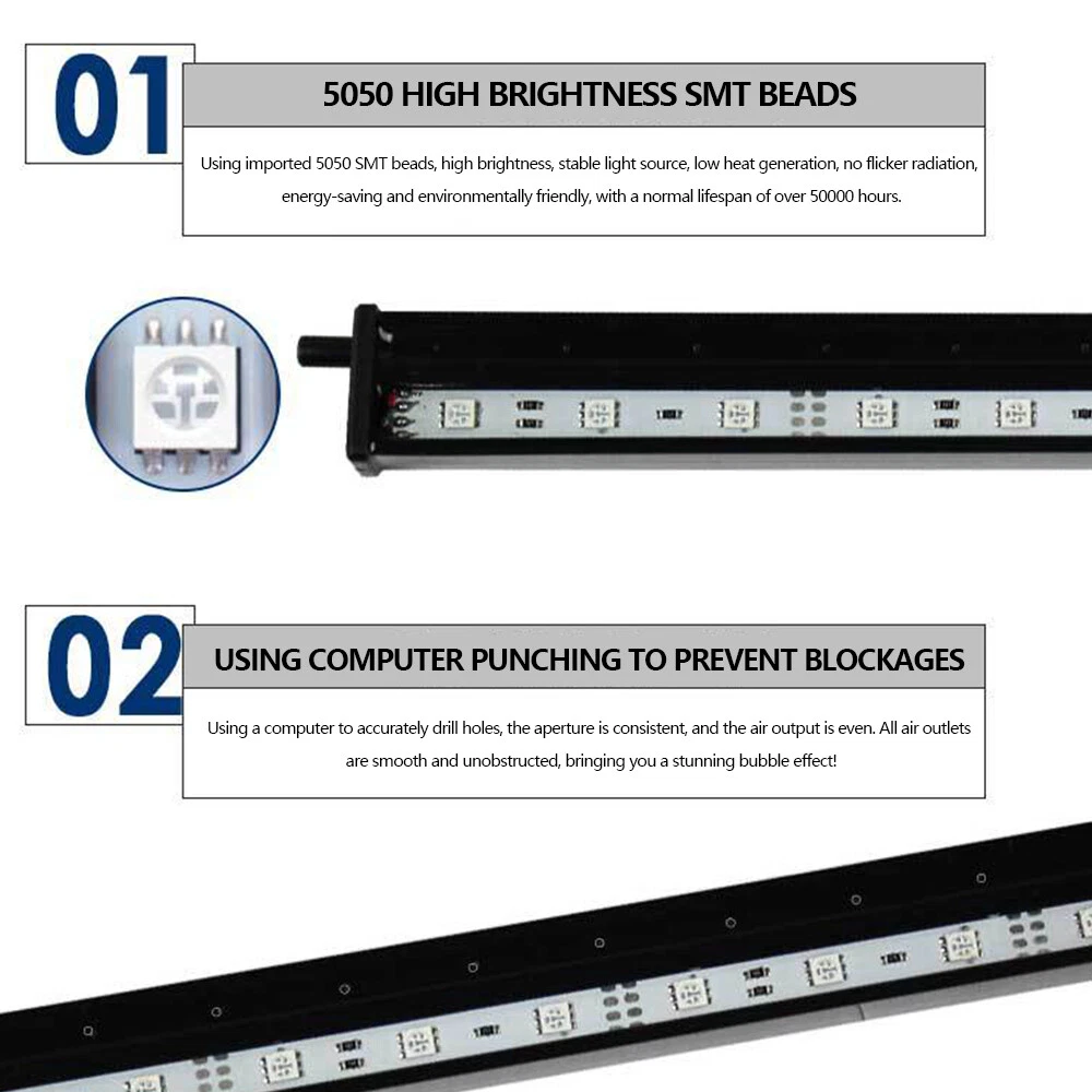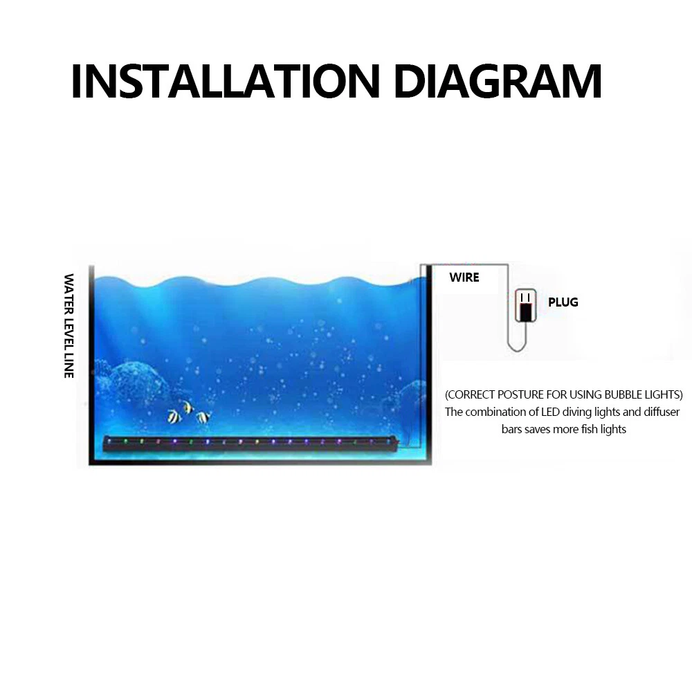 Underwater Aquarium LED Light Fish Tank RGB Submersible Lamp + Remote Specification for 20in-RGB(W/ Bubble+Remote) Type: Aquarium Light Light Length: 52cm/ 20.5 in Power: 4.2W Plug Type: US Plug LED Chips: 5050RGB LED lamp bead number:21 LEDs Proteciton grade: IP68 Package Includes: 1x bubble light 2x remote controller (Batteries not included) 3x suction cup 1x 1m gas pipe Specification for 11in-Blue&White/RGB(No Bubble+Remote) Voltage: 90-260V, 50/60HZ Light Color: Blue+White/ RGB Material: Plastic Lamp bead model: 5730 Length: 11" LED: 18 LED Power:6W Package Included: 1X LED aquarium light Features for 20in-RGB(W/ Bubble+Remote) 🐠Aquarium light: high efficiency, low power consumption. it can save more of energy and cost. 🐠Safety: IP68 Waterproof grade, long service life. 🐠Submersible aquarium light: with imported LED bulb,strong illumination can effectively promotes the photosynthesis. 🐠LED aquarium light: 24-button board with 16 single colors and 4 dynamic colors, energy saving and environmental protection lamp beads, long life. 🐠Attention: Before use, the air inlet of the air stone is on the top, and it is soaked in water at 45° until the air in the air stone is discharged. Soak for 24 hours for better results. Features for 11in-Blue&White/RGB(No Bubble+Remote) : 1. High light 5730 SMD lamp beads, energy saving. 2. IP68 waterproof rating, amphibious. 3. 12v working voltage, make your fish safer. 5. with super bright 7000-7500k white LED and rich 460nm blue light for plants and fish 6. Built-in dimmer: 11inch light with 18LED 7. waterproof and easy to install, you can buy and use with confidence. Three light source options: - Blue and white, cool and bright, suitable for water plant growth; - RGB, ice blue, emerald green, bright red three color lamp beads, brighten the color, make the luster more gorgeous, suitable for ornamental fish; Payment Delivery details Terms of sales About us Contact us Payment 1.We accept PayPal/credit/Gpay 2.All payments must be received within 10 days after auction won 3.Non-pay bidder will get a negative feedback and an unpaid alert from eBay 4.E-checks via Paypal will be hold until it is cleared Delivery details Most Items Free Shipping within the 48 States. We ship within the United States only. The term EXCLUDES the states of Alaska, Hawaii and all off-shore U.S. territories and possessions such as Puerto Rico, Guam and Virgin Islands. We do not ship to APO and FPO . Delivery Time: 4-7 business days (Varies by Destination) Shipping Carriers are responsible on the delivery time. If you have any questions or problems with delivery, please contact carrier directly Standard Order Processing time: All items will ship within 24 hours (Monday - Friday). Payment cleared/received on Friday will be shipped on the next business days (Monday or Tuesday) We are not responsible for carrier transit time. This information is provided by the carrier and excludes weekends and holidays. Note that transit times may vary, particularly during peak periods or in climate weather conditions, and that delivery times frames will need to be extended for any processing time frames in excess of 1-2 business days. Terms of sales We fully guarantee Customers benefit within 30 business days if item DOA (damage on arrival), and please contact us within 30 days from the delivery date to exchange or refund. No need click "Return", please just contact us via Ebay Message. If you insist on returning the item, please choose the reason "nolonger need it' for returning processing. You will get the replacement or refund through the communication between us. About us We strive for 100% Customer Satisfaction and high quanlity products. If you have any questions or any problems on your purchase, please feel free to contact us via Ebay Message Contact us Via eBay message system , you will get our response within 24 working hours during business days from Monday to Friday. We apologize for the late reply during the holidays or weekends. Please send all correspondence through the ebay messaging system. All Technique questions, must be asked via ebay message. Emails will be applied during business hours: 9AM to 6PM Pacific Time. Monday to Friday only (excluding Holidays). After hours emails will be replied on the next business day. Plug Type US Plug Bulb Type LED MPN Does Not Apply Material PVC+ Aluminum Proteciton grade IP68 Brand Unbranded Type Fish Tank Light Energy Star 5 Stars Water Type All Water Types LED Chips 5050RGB Model Remote Features Color Enhancing Application Underwater
