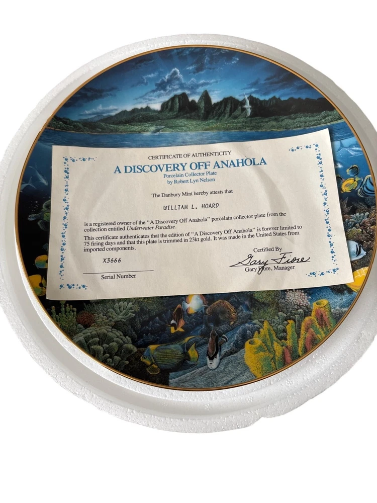 This exquisite porcelain plate features the stunning artwork of Robert Lyn Nelson, capturing the serene beauty of marine life. Part of a limited edition, this collector's piece is a testament to craftsmanship and artistry. It's a timeless addition to any fine art collection. • Diameter: 10.5 inches • Material: 23K gold rim • Limited edition of 75 firings • For decorative use only • Includes certificate of authenticity Condition: Pre-Owned Like New Like new condition with certificates. NO Major damages "Power Selling Mom Consignment"