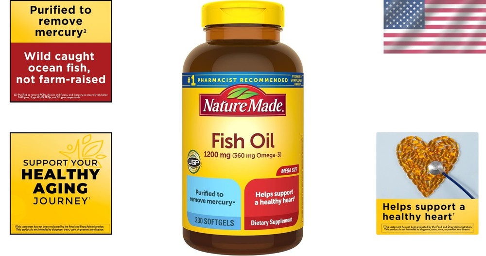 Item Weight: 15.2 ounces Product Dimensions: 3.5 X 3.5 X 6.63 Inches; 15.2 Ounces Item Form: Softgel Active Ingredients: Fish Oil, Omega-3 Type: Vitamin Flavor: Unflavored Unit Count: 230 Count Age Range (description): Adult Formulation: Softgel Primary Supplement Type: Vitamin Diet Type: Gluten Free gtin13: Does not apply Main Purpose: Heart Health Product Benefits: Dietary Supplement,heart Health Support Brand: Unbranded When to Take: With Meal Expiration Date: Fish Oil Supplements Dosage: 1200 mg Item Dimensions L X W X H: 3.5 X 3.5 X 6.63 Inches Size: 230 Count (pack Of 1) Features: Gluten-Free, Dairy-Free, No Artificial Flavors, No Color Added Ingredients: Omega-3, Fish Oil UPC: Does not apply Number of Pills: 230