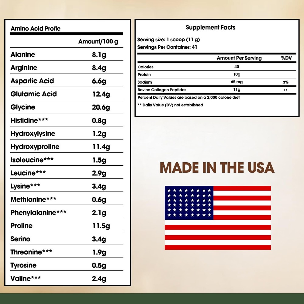 Collagen is the main protein in our bodies that helps support our strength,flexibility and movement. ENHANCED YOUTHFUL GLOW: Our collagen powder, designed for both women and men, offers the necessary protein and amino acids to promote strong nails and a radiant, youthful complexion. By supporting your skin, hair, nails, and joints, this collagen supplement serves as a powerful daily aid for overall vitality and rejuvenation from within Top-Quality Ingredients: We are committed to utilizing the most superior ingredients available. Our Hydrolyzed Bovine Collagen peptides are sourced from grass-fed cows of exceptional quality, guaranteeing a pure and sustainable origin. Moreover, our ingredients are procured from farms in the USA, ensuring both purity and effectiveness Easy Daily Integration: Adding our Hydrolyzed Bovine Collagen to your daily regimen is a breeze. Simply blend 1 scoop into 8 oz of water or your preferred beverage for a seamless, quick-dissolving drink. Whether mixed into your morning smoothie, post-workout shake, or just with water, at only 40 calories per serving, it offers a convenient and efficient method to incorporate collagen into your routine every day—anytime, anywhere GREATER COLLAGEN CONTENT PER SCOOP: Our Hydrolyzed Bovine Collagen boasts 11 grams of type 3 and 1 low molecular weight hydrolyzed collagen peptides, encompassing 18 amino acids like glycine, proline, and hydroxyproline. These components aid in fortifying muscle cells and nourishing hair and nails, combating thinness and brittleness. Each serving delivers 10 grams of protein Unflavored: Experience the advantages without changing the flavor of your preferred drinks. Our product is free from GMOs, artificial ingredients, sweeteners, dyes, additives, or fillers - offering only pure, top-notch Hydrolyzed Bovine Collagen
