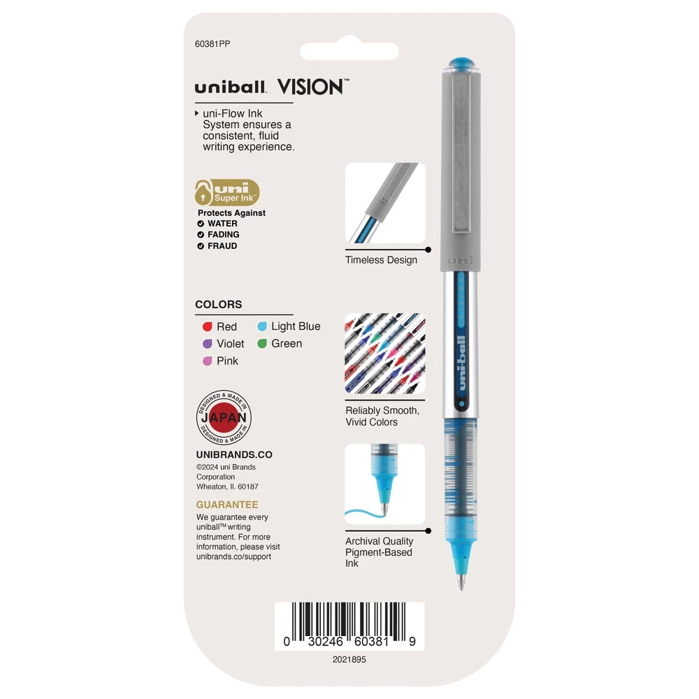 Product Description Step into a world of timeless elegance and unparalleled craftsmanship with Uniball, a brand that has woven its legacy into the fabric of fine writing instruments. With a heritage rooted in innovation and a commitment to excellence, Uniball has consistently delivered a writing experience that stands the test of time. Immerse yourself in the art of writing with Uniball's meticulously crafted pens, proudly made in Japan. Our legacy of precision and quality is evident in every stroke, ensuring that your thoughts flow seamlessly onto paper with each movement of the pen. From Gel Pens to Rollerball Pens, Ballpoint Pens to Fineliner Pens, and Mechanical Pencils, Uniball offers a comprehensive range that caters to every writing style and preference. Dive into a world of versatility with Uniball's diverse range of tip sizes, spanning from the ultra-micro 0.38 for intricate detailing, to the bold 1.0 for striking emphasis. Whether you're sketching, journaling, note-taking, or bringing ideas to life, Uniball empowers you to effortlessly transition between strokes, giving your writing a unique dimension that captivates the eye and stirs the soul. As you hold a Uniball pen in your hand, you're not just embracing a writing instrument – you're embracing a legacy of craftsmanship, innovation, and the pursuit of perfection. Each pen is a testament to our dedication to providing you with an unmatched writing experience, where every word is an ode to the art of communication. Start your story with Uniball, where heritage meets modernity, and each stroke is an invitation to immerse yourself in a world of boundless expression. Join a community of discerning individuals who appreciate the value of quality, heritage, and the power of the written word. Experience the magic of Uniball for yourself and discover the joy of writing that transcends time and leaves an indelible mark on every page. From the Manufacturer Vision Rollerball Pen features an innovative system that regulates a steady flow of waterproof ink to the point for consistent smoothness and color intensity. Uni Super Ink helps prevent check and document fraud. Solid, stainless steel point is quiet, responsive and won"t bend under pressure. Uncapped pen offers a visible ink supply. Ink is acid-free, fade-resistant and water-resistant. Nonrefillable. ROLLERBALL PEN: Capture the details with the superior precision of our roller ball pens; Our fine-point ink pens come filled with vibrant, smooth-flowing ink that won't fade. UNI FLOW INK SYSTEM: Equipped with an exclusive ink system, our fine-point pen delivers smooth-flowing pen ink, allowing you to create concise, flawless documents with vibrant lines. UNI SUPER INK: Water- and fade-resistant ink helps you compose long-lasting, high-quality documents you can archive; Our pens offer protection against water, fading, and fraud for both personal writing and professional writing. QUALITY CONSTRUCTION: Equipped with a visible ink window, our writing pens ensure you don't run out unexpectedly; Convenient clip attached to the writing pen ensures that your favorite ink pen is always at hand. VISIONARY PERFORMANCE: Designed for everyday use, our fine-tip color pens combine solid writing, vivid lines, and a classic look enhanced with colorful accents.