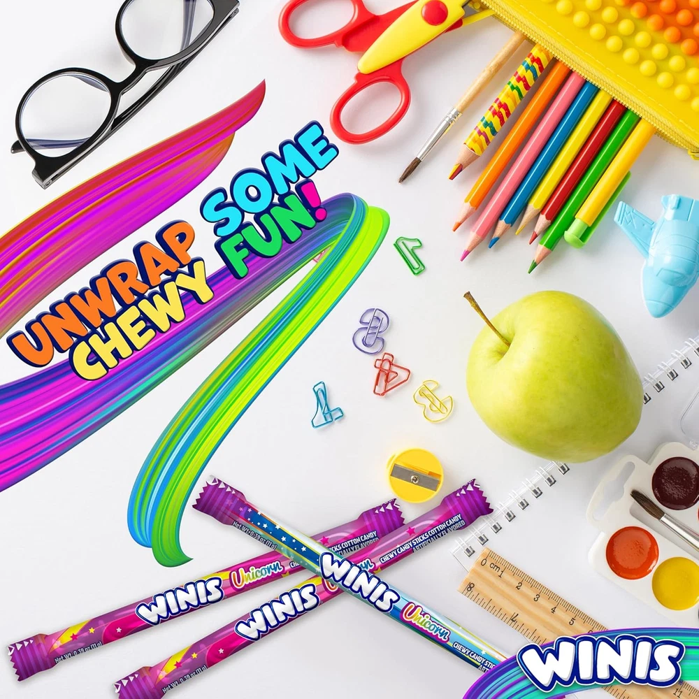 TEXTURE AND FLAVOR: Experience the unbeatable soft, chewy texture of taffy. Indulge in cotton candy for a delightful burst of sweetness. Go ahead, treat yourself! COTTON CANDY FLAVORED FUN: Dive into sweetness with just one purchase! Our Winis Unicorn pack boasts 11 pieces, bursting with all the whimsy and flavor your taste buds crave. Let the magical munching begin! ALLERGY FRIENDLY: These candies have everyone covered – kids or adults, we've got you! No high-fructose corn syrup, peanuts, or tree nuts. It's a treat for all, worry-free indulgence! SHARING SIZE: Forget about the fuss of single candies; grab this all-in-one delight! With 11 chewy candy sticks in this bag, it's a treasure trove of flavor. Share the love or savor it solo – either way, it's a win-win for your taste buds! THE NEW FLAVORFUL TAFFY CANDY: With our Winis Taffy Candy, you're in for some of the tastiest treats! Let your taste buds go on a journey and explore the amazing flavors of all our candies. VARIETY: Sweet taffy in Cooton candy chewy sticks Satisfy all your sweet tooth cravings with just one purchase. This variety pack contains 11 pieces & all the fun and flavor you can imagine. BULK: No need to purchase individual candy bags when you have everything in one 11 pieces of candy included in this bag gives you the best bang for your buck. ALLERGY FRIENDLY: Whether it’s your kids or for yourself (yes you), these candies take everyone into account. No high-fructose corn syrup, peanuts or tree nuts. A POPULAR HISPANIC TREAT: Our Winis Taffy Candy you will get some of the most popular and mouthwatering treats from Mexico. Take your taste buds on new adventures and discover the great taste of all our candies. TEXTURE AND FLAVOR: There is nothing like the soft chewy chew of taffy. Enjoy it in Cooton Candy Flavored!