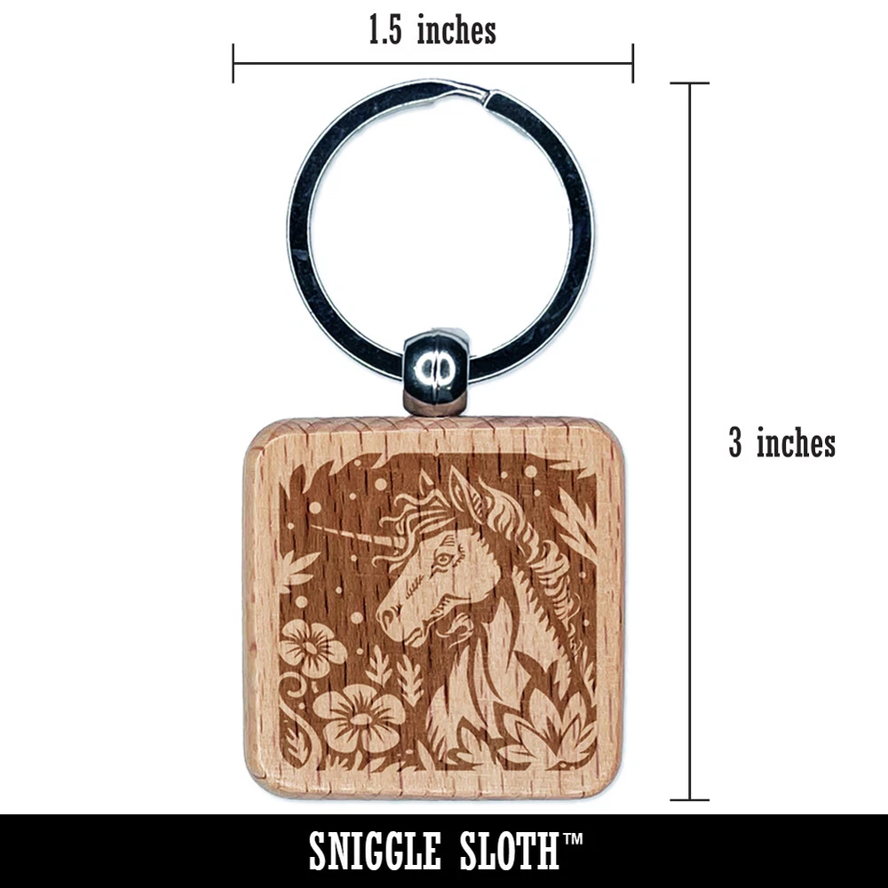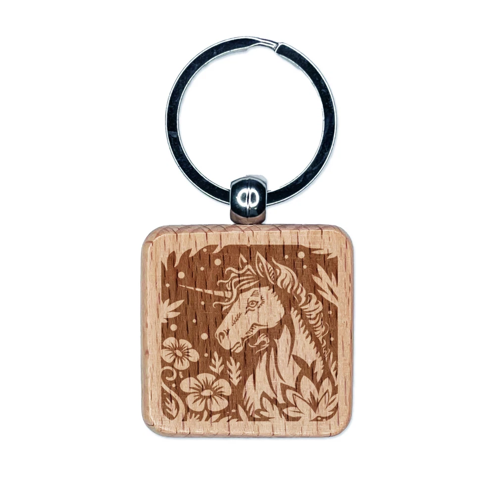 Unicorn in Flower Forest Engraved Wood Square Keychain Tag Charm