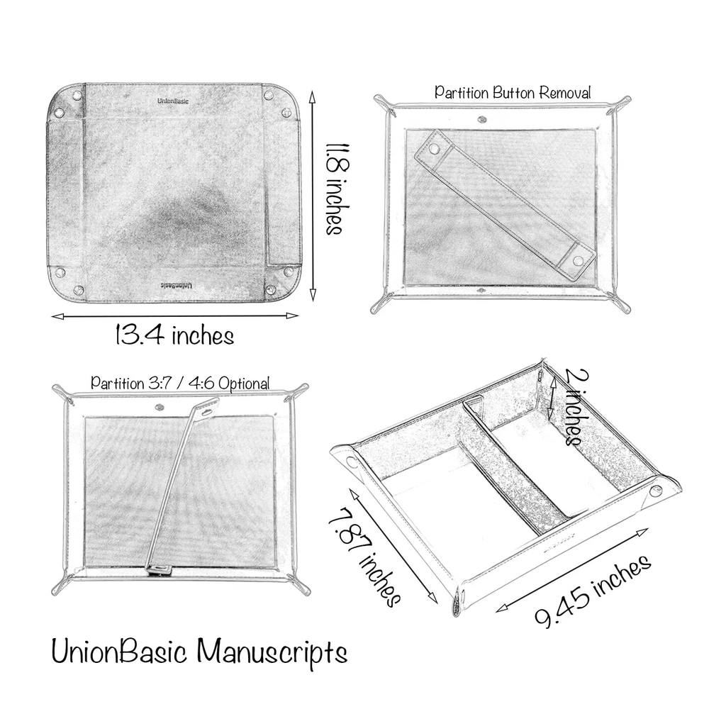 Delicate fully faux leather texture, elegant stitched design, cute and adorable appearance, multi color choice for sorting in use Simple and generic construction easy to use, easy to carry, with snaps in the 4 corners to make it is easy to fold and unfold. Easy to clean, only need wipe gently with wet cloth to restore the bright Plus Series is upgraded both in material and size. Made of selected faux leather with cowhide lines pattern. Larger size to hold your watches, jewelry, keys, coins, change, candy, even mobile phones and so on. Measurements: 13.39" x 11.8" x 0.16" when unsnapped and 9.45" x 7.88" x 2" when snapped Great as handy key tray for entryway table, nightstand organizer, bedside valet holder, catchall caddy for coins, keys, watches, sunglasses, office stationery, electronic gadgets and so on. Flat and snapped design also make it convenient to carry in suitcase when travel. Could be used as table valet tray for pocket stuff like keys, coins, cards, jewelries when traveling
