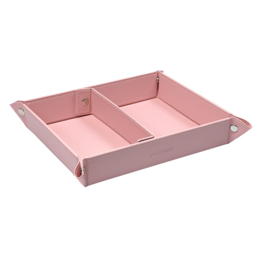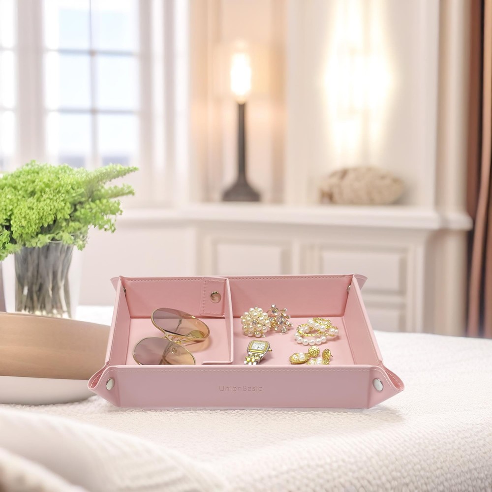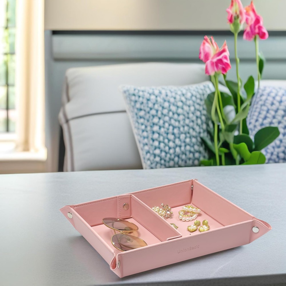 This valet tray is a stylish and practical must-have! The faux leather feels premium, and the stitched design adds a touch of elegance. Love how it keeps my jewelry, keys, and phone organized—plus, the snap corners make folding and storing a breeze. The candy pink color is adorable, and it’s so easy to clean with just a quick wipe. Perfect size for daily essentials!