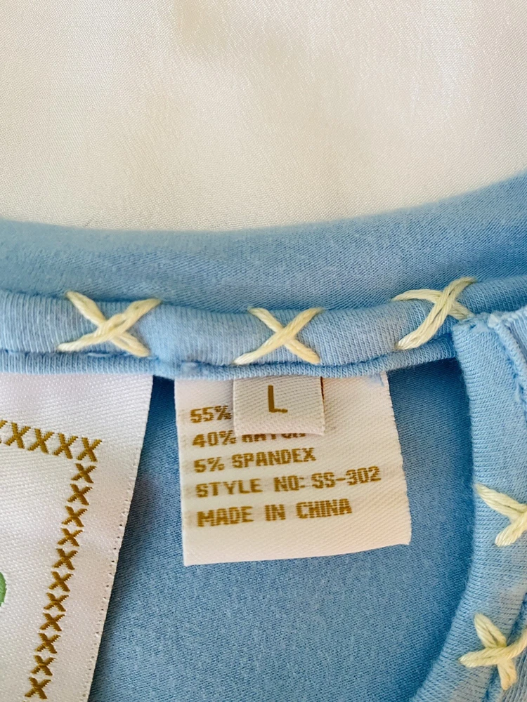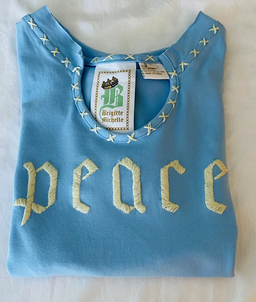 Description: For your bidding consideration is a Unique Bridgitte Michelle Blue and White PEACE Short Sleeve T-shirt Size L. Double seam Sleeves and Double seam hem with embroidered Pease and Lion with embroidered work around collar. Nice! Please see the other items that I have listed ~ Objet_de_arto ~ MY POLICIES PLEASE READ - IF BID YOU AGREE : Payment : Please make payment within TWO days of the end of the auction . NOE-checks - PAYPAL ONLY *** Due to an increase of non-paying buyers, an unpaid item case will automatically be opened if payment is not made within 2 days. Shipping : fast shipping ! I will ship your items to you the same day I receive your payment whenever possible. When payments are made after 2 p.m. Monday thru Friday or on weekends and Holidays I will ship your item the next business day. Packing, time, gas supplies, and fees are included, so if shipping is high, please pass on my items, thank you. I am always willing to combine shipping costs (combined shipping First Class or Priority, whichever is best for the items/quantity) when more than one item is purchased, so check out the other items that I have listed! Refunds : Only for gross errors. Not for remorse or very minor things such as an excuse. Feedback : I appreciate your business and prompt payment. I leave positive feedback and I appreciate you leaving me positive feedback too. If you have any questions regarding your purchase please contact me before opening a case or leaving any neutral or negative feedback so that I can have the opportunity to resolve the issue so we both are happy! Thanks so much! Communication : Through eBay messages for questions, please.