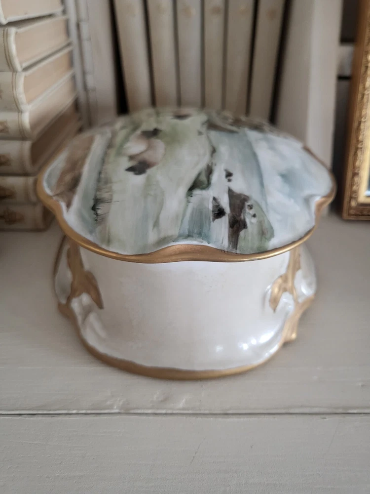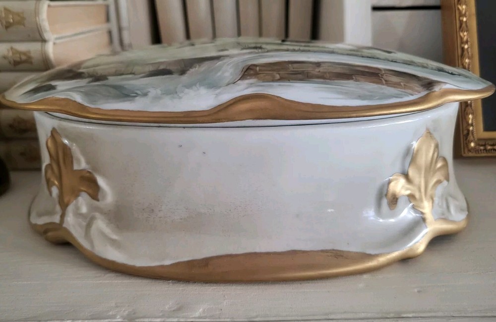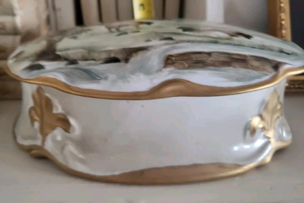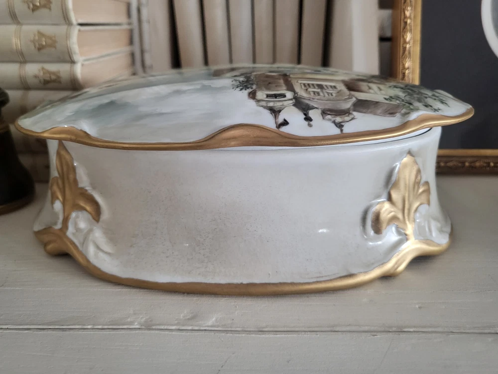 Unique Large Hand-Painted Porcelain Trinket Box with French Scene Lid