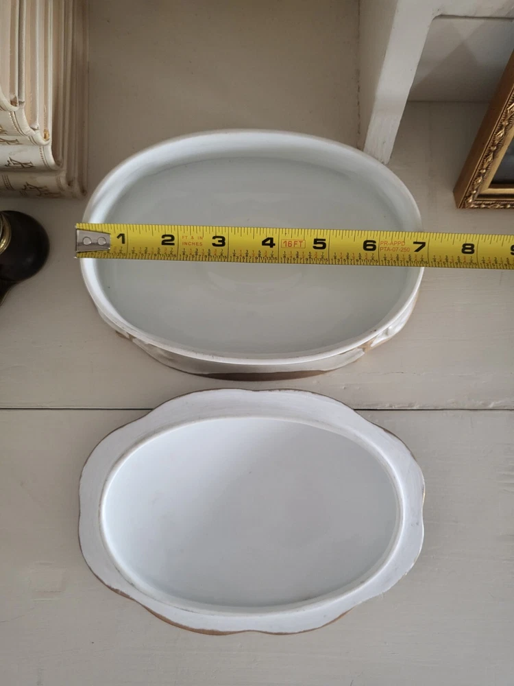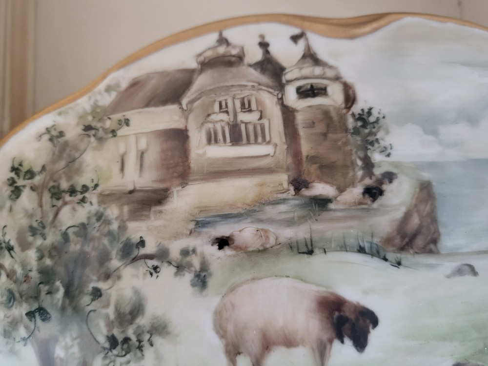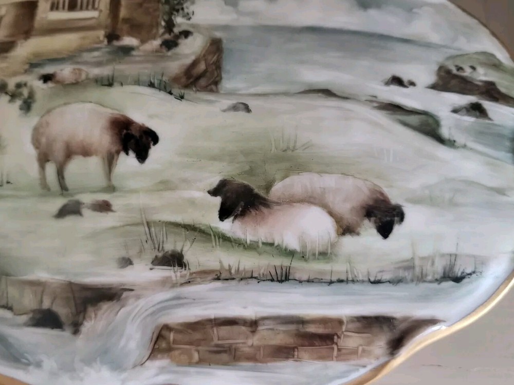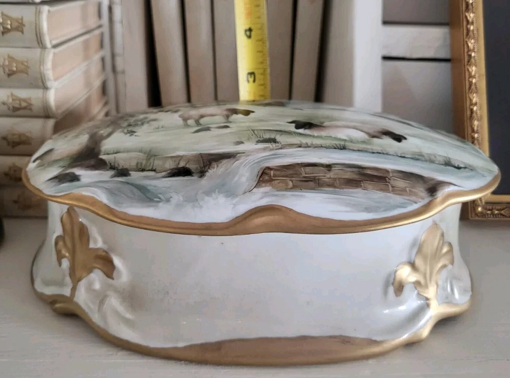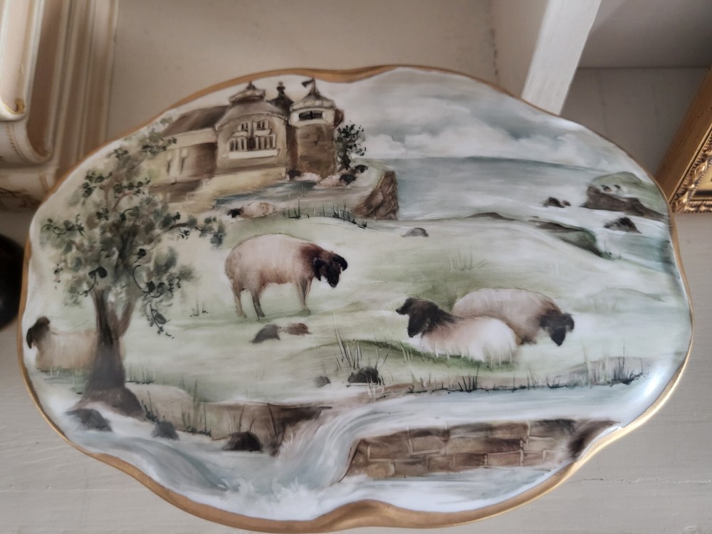 Type:Trinket BoxPattern:country FrenchTheme:castle and sheepMaterial:PorcelainColor:MulticolorCountry/Region of Manufacture:UnknownBrand:UnbrandedStyle:FrenchSubject:LandscapeShape:OvalFeatures:Hand PaintedSize:Large