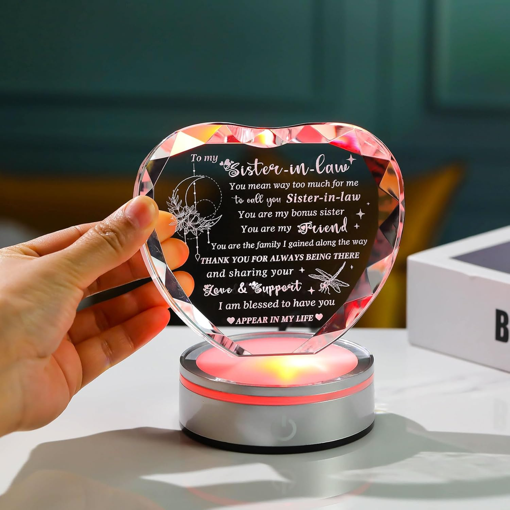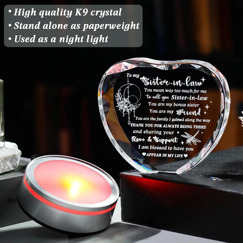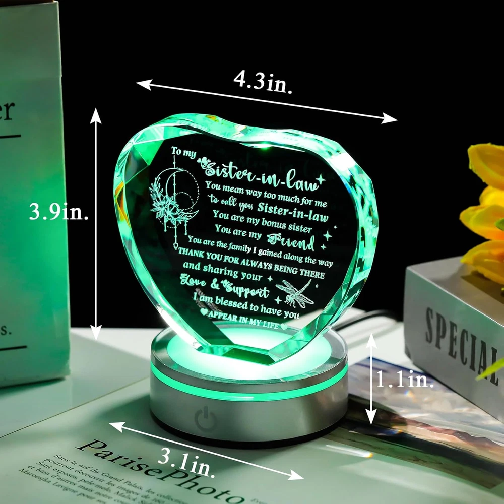 Store New Arrivals Add to Favorite View Feedback Contact Gifts for Sister in Law Crystal Ornament Birthday Unique Gifts, Laser Engraved Sister in Law Gifts for Women from Sister in Law on Christmas Mothers Day with Colorful LED Base Description Light Source Type LED Style Sister in law-2 Number of Items 1 Power Source Corded Electric Number of Light Sources 1 Material Type Crystal Lighting Method LED Finish Types Polished Lamp Type Desk Lamp Room Type Living Room Product Dimensions 3.1"D x 4.3"W x 5"H Model Number 1 Installation Method Tabletop Finish Type Polished Specific Uses For Product Decoration Included Components Gift Box, Wiping Cloth, Gift Card Is Product Cordless No Control Method Touch Water Resistance Level Not Water Resistant Item Weight 1.69 Pounds Connectivity Technology USB Special Features 变色 Mount Type Tabletop Shade Color Clear Color Sister in Law-2 Item Dimensions D x W x H 3.1"D x 4.3"W x 5"H Indoor Outdoor Usage Indoor Base Material Glass Recommended Uses For Product Decoration Shade Material Glass Switch Type Push Button 💕Sister in Law Birthday Gifts: If you want to show your sister in law how much you appreciate her presence in your life, this keepsake is the perfect present for Christmas, Birthday, Wedding or Mothers Day 🎁Original And Best Sister In Law Gifts: Our meaningful gifts for sister-in-law is the perfect way to welcome the new sister in law in your life. Whether she has been in the family for years now or it is the wedding day, our best sister-in-law gifts will be sure to give her joy when she opens it. The sweet message is a way to tell her that she is the best, and that you are so thankful that you get to be a part of her family 🎁Materials & High Quality: Made with the highest k9 crystal, Each crystal is hand-polished, without any bubbles, impurities or scratches. The words laser engraved inside the crystal will never fade or disappear. It is transparent, shiny and very durable 🎁Specification & Gifts package: Size is about 4.3*3.9in". Every Crystal gift will come with a nice gift box, wiping cloth, and Gift card. It can be placed independently, placed in the living room, bedroom or office as decoration, and placed on the fireplace, desk, closet, or storage cabinet will be very attractive 💕Movdyka Vision- The crystal gifts can be used as home decor for any place, Movdyka strives to bring the best quality products with a special message of hope and encouragement to each one. If there are any problems with the product, please , we will help to fix the problem any time Crystals Sister In Law Gifts For Women, Heart Shape Glass Keepsake Decor Anniversary Wedding Birthday Gifts For Sister In Law Product Features: 1. Made with K9 Highest-quality Crystal, Making the Crystal More Transparent and Glossier. 2. The Laser Engraved Pattern, without Breaking the Surface of Crystal, All Patterns are Clear and Distinct. 3. The Exquisite Packing Box Looks Delicate and Classy. Product Specification: Color of Crystal: Clear Material: K9 Crystal Crystal Size: 4.3*3.9in" Package Include: 1 x Crystal 1 x Cloth for Cleaning Crystal 1 x Gift Card 1 x Cardboard Gift Box 1 x LED Base 1 x USB cable Order yours today and enjoy! ABOUT US We offer the best prices around on high quality products. Our E-store includes media such as books, movies, music and games while offering electronics, toys, sporting apparel, clothing, tools, general home, garden items and more. SHIPPING We are always working hard to ensure your package arrives as soon as possible. Please understand that some factors like weather, high postal traffic, and the performance of shipping companies are outside of our control. We offer free shipping to the lower 48 states and ship within 2 business days of payment, usually sooner. We do not accept P.O. Boxes. Please provide a physical address. For shipping outside of the continental USA, we only use eBay's Global Shipping Program.The item is shipped to KY and then sent to the rest of the world. International customers are responsible for all duties and taxes. Continue to check out in order to calculate costs for shipping the item to your country. Messages regarding eBay's Global Shipping Program MUST be directed at eBay EXCLUSIVELY. RETURNS We offer a 30-Day Return Policy on items which you are not completely satisfied with. You have the option for a full-refund or an exchange of the item. No returns are available on items shipped outside of the USA. PAYMENT We accept PayPal. CONTACT US This page content is yet to come Please ad us to your favorite seller and visit again later Thank You CUSTOMER SATISFACTION We try our very best to make sure every customer is completely satisfied. If there's a problem, message us! We're happy to help. WE ACCEPT Copyright © 2021 AutoDS. | All Rights Reserved