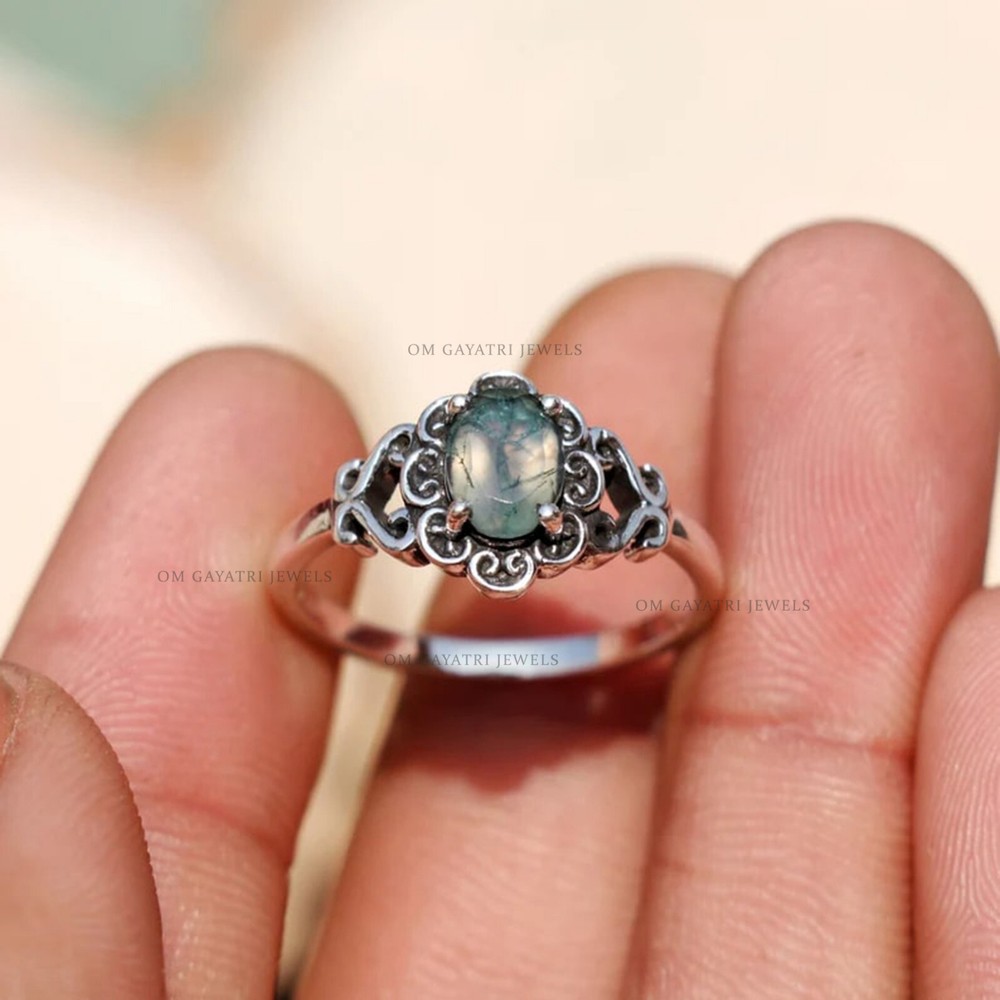 This unique handmade ring features a beautiful oval-shaped moss agate gemstone, set in 925 sterling silver. The ring is stackable and has a bezel setting style, with a band width of 2mm. The main stone measures 6mm in width and 8mm in length, with a depth of 2.5mm. The ring is perfect for any occasion, whether it be for engagement, Christmas, wedding, anniversary, birthday, or Valentine's Day. The vintage-inspired design and art deco era make it a one-of-a-kind piece. It is signed by the seller and comes with a seller warranty. Make it a customized gift for someone special with this stunning moss agate gemstone ring. Unique Moss Agate Gemstone 925 Sterling Silver Handmade Ring 6x8mm Agate Ring Gemstone:- Moss Agate Stone Size:- 6x8mm Stone Shape:- Oval Stone Category:- Faceted Metal:- 925 Sterling Silver