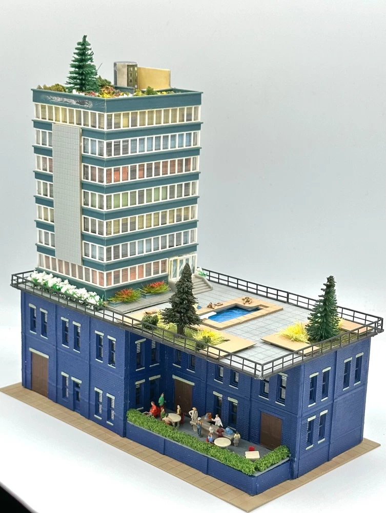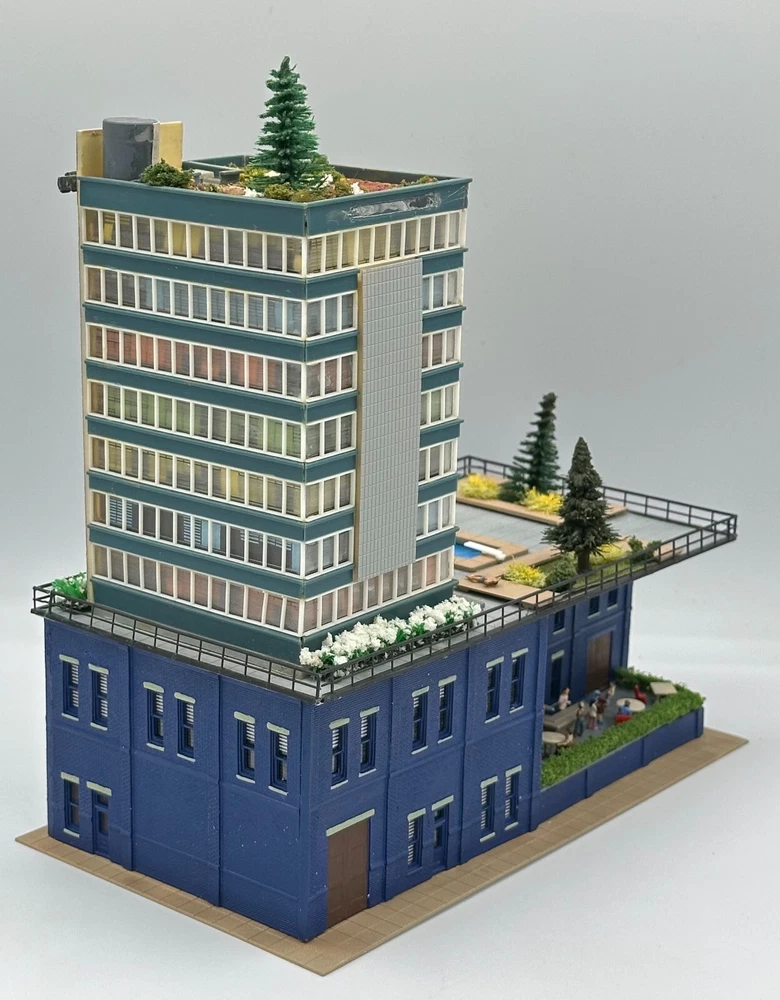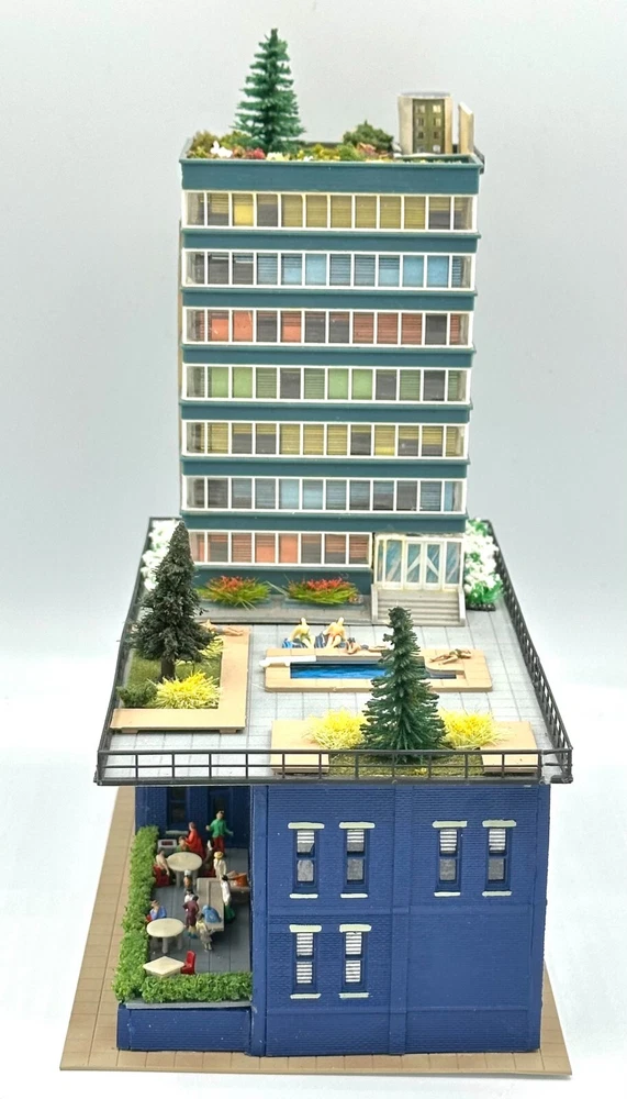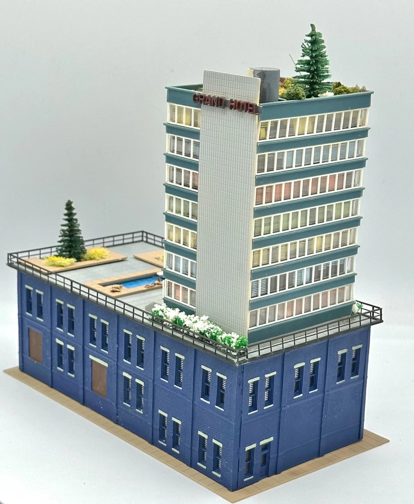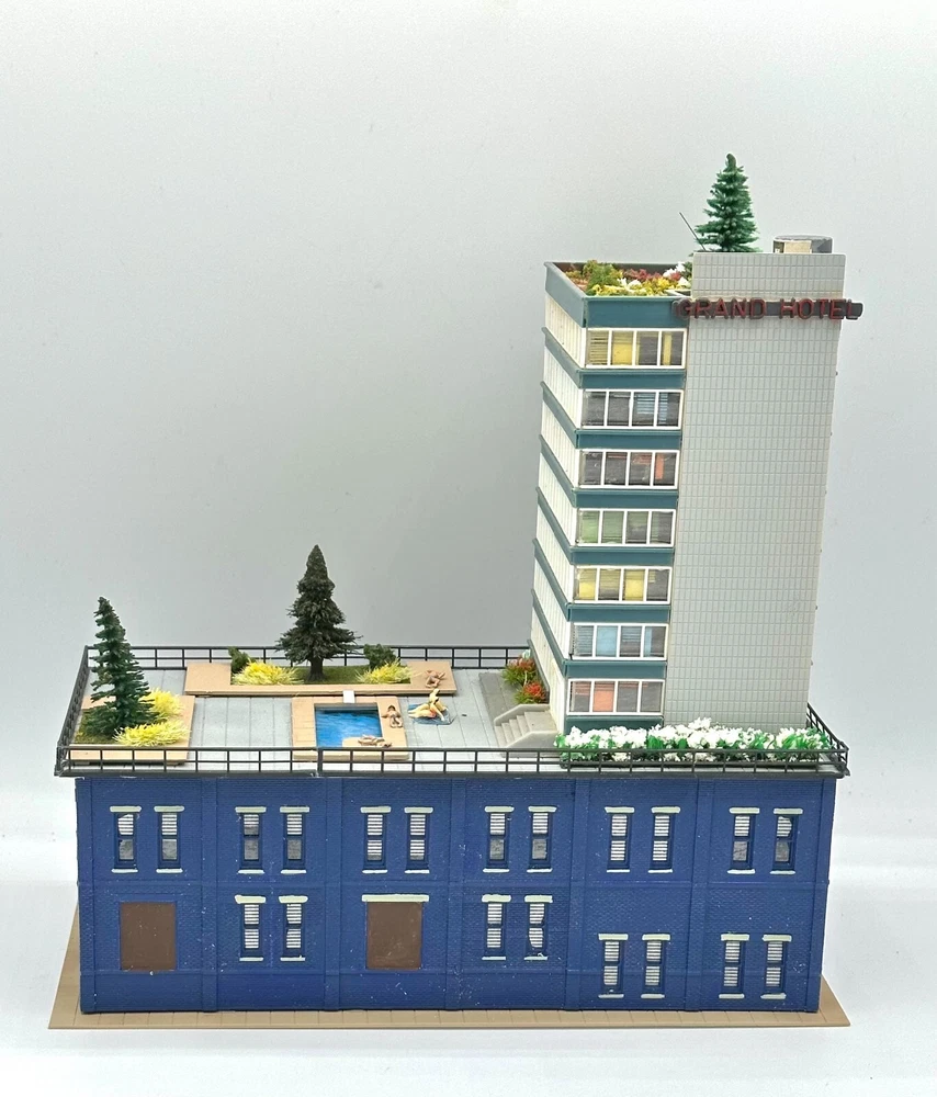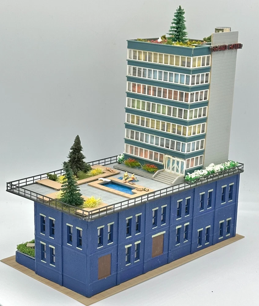 Unique One-Of-Kind N Scale Custom Built/Painted 9-Story Tower " Grand Hotel" Fully Assembled Diorama Fully assembled Without a box, Window treatment.Landscaping 8" Wide. 4" Deep 9" Tall. * We Combine Shipping costs on Multiple purchases, shipped in one package, just purchase the items and wait to receive an invoice with the reduced shipping cost before you pay.