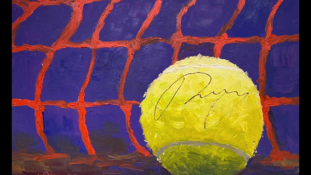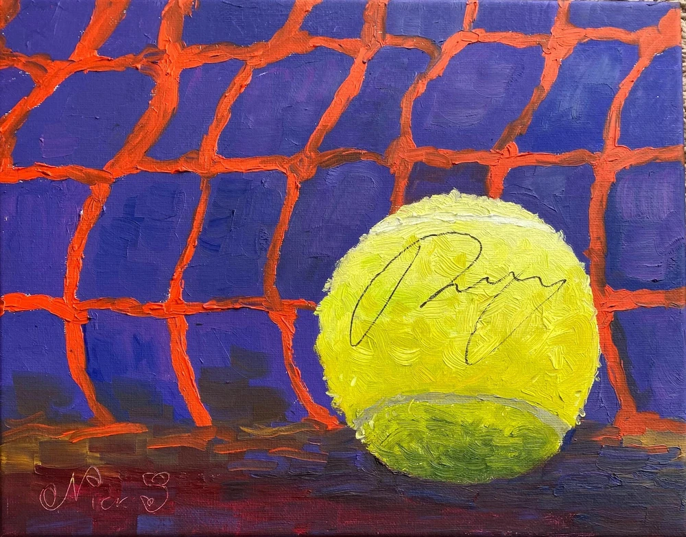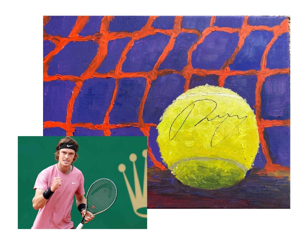 Introducing a one-of-a-kind masterpiece for tennis enthusiasts and art collectors alike! This vibrant oil painting captures the essence of the sport, featuring a dynamic close-up of a tennis ball against a vivid net background. The rich colors and bold brushstrokes bring the scene to life, evoking the energy and intensity of the game. But what truly sets this artwork apart is the autograph gracing the tennis ball—none other than Andrey Rublev, a celebrated figure in the tennis world. This piece isn’t just a painting; it’s a unique fusion of art and sport, commemorating the talent and spirit of a modern tennis legend. Andrey Rublev’s signature adds a personal touch that elevates this painting from an exquisite artwork to a cherished collectible. Known for his powerful gameplay and vibrant personality, Rublev’s autograph brings his passion and dedication right into your home. Whether you’re a fan of his incredible tennis career or simply appreciate the beauty of this colorful piece, the signed ball serves as a focal point that draws the eye and invites admiration. It’s a rare opportunity to own a piece of art that’s both visually striking and personally connected to one of the sport’s brightest stars. The painting’s composition is carefully crafted to highlight the contrast between the textured, glowing tennis ball and the intense backdrop of the net. The use of bold, contrasting colors—deep blues and purples against the fiery orange of the net—creates a dynamic visual impact that mirrors the excitement and unpredictability of a thrilling tennis match. The thick, expressive brushstrokes add depth and movement to the piece, making it feel as though the ball could bounce right off the canvas and into your world. This artwork is not just for tennis lovers but for anyone who appreciates the intersection of athleticism and artistic expression. Don’t miss your chance to own this unique, signed painting that celebrates both the sport of tennis and the artistry of oil painting. It’s perfect for displaying in a sports-themed room, an art gallery, or any space where you want to make a bold statement. As a conversation starter and a testament to the skill of both the athlete and the artist, this piece is truly unmatched. Add it to your collection today and experience the thrill of having a slice of tennis history hanging on your wall!