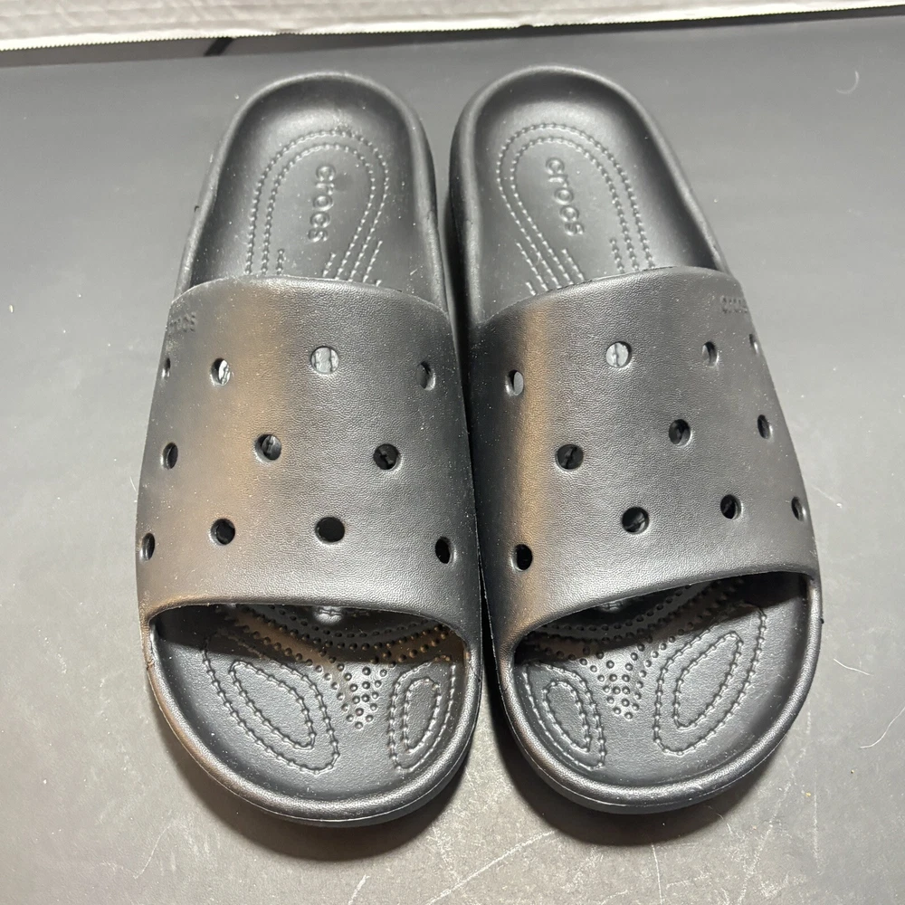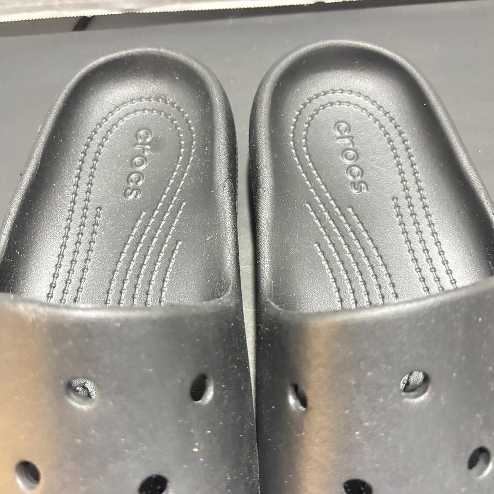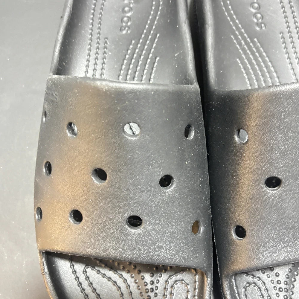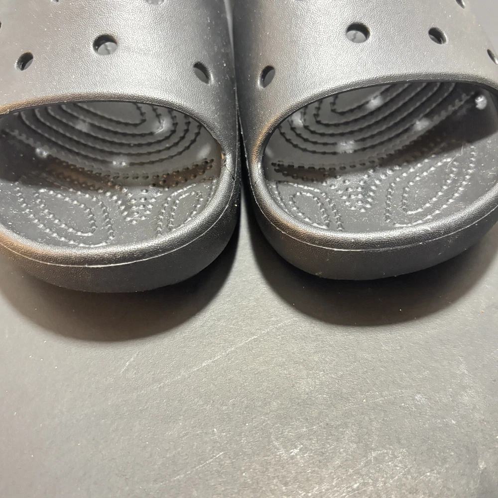 Accents: Logo Lining Material: Croslite Upper Material: Croslite MPN: 10001 Closure: Slip On US Shoe Size: 10 Color: Black Features: Comfort Insole Material: Croslite Shoe Width: M Outsole Material: Croslite Style: Slide Country/Region of Manufacture: China Department: Men Pattern: Solid Fabric Type: Croslite Customized: No Character: Crocs Vintage: No Type: Casual Seller Notes: “These are New .They were tried on and walked around for a few minutes. Great” Model: Classic Clog Brand: Crocs Toe Shape: Round Toe Season: Spring Product Line: Crocs Classic Clog Occasion: Casual Theme: Classic