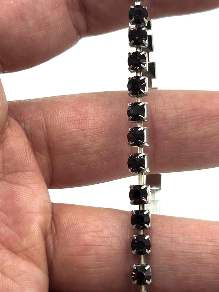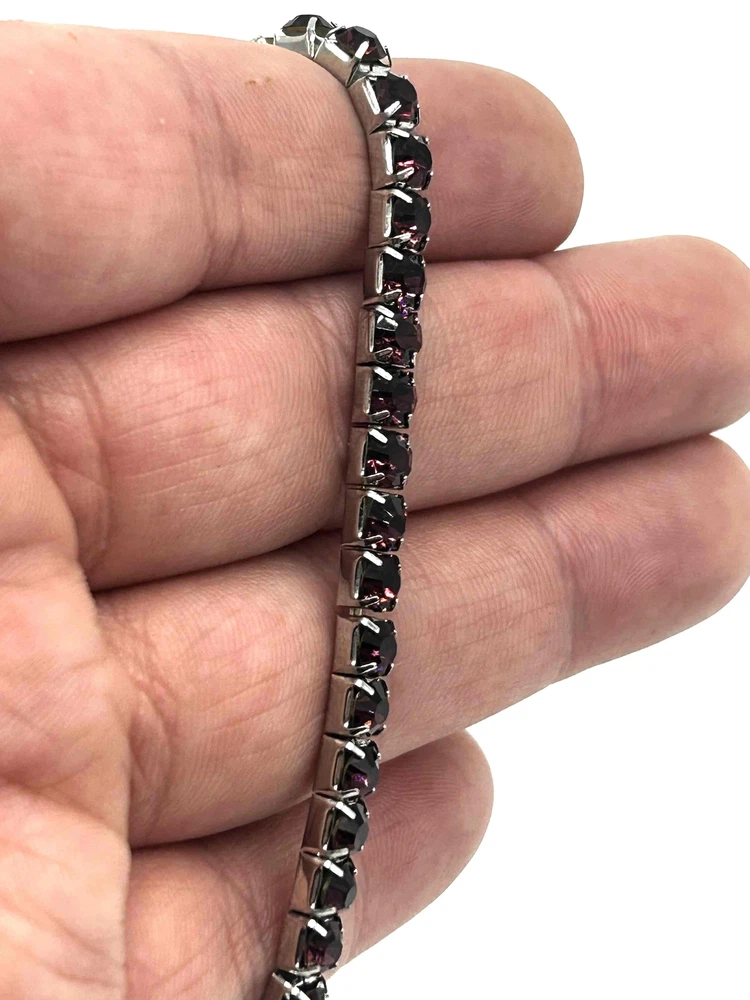Country/Region of Manufacture: Unknown Main Stone Treatment: Unknown Main Stone Creation: Simulated Color: Purple Occasion: Anniversary, Birthday, Wedding Main Stone Color: Purple Material: Rhinestone Era: Undated Theme: Fashion & Costumes Vintage: Yes Brand: Unbranded Secondary Stone: Crystal Sizable: No Style: Tennis Metal Purity: Unknown gtin13: Does not apply Base Metal: Unknown UPC: Does not apply Personalize: No Type: Bracelet Item Length: 7 in Metal: Silver