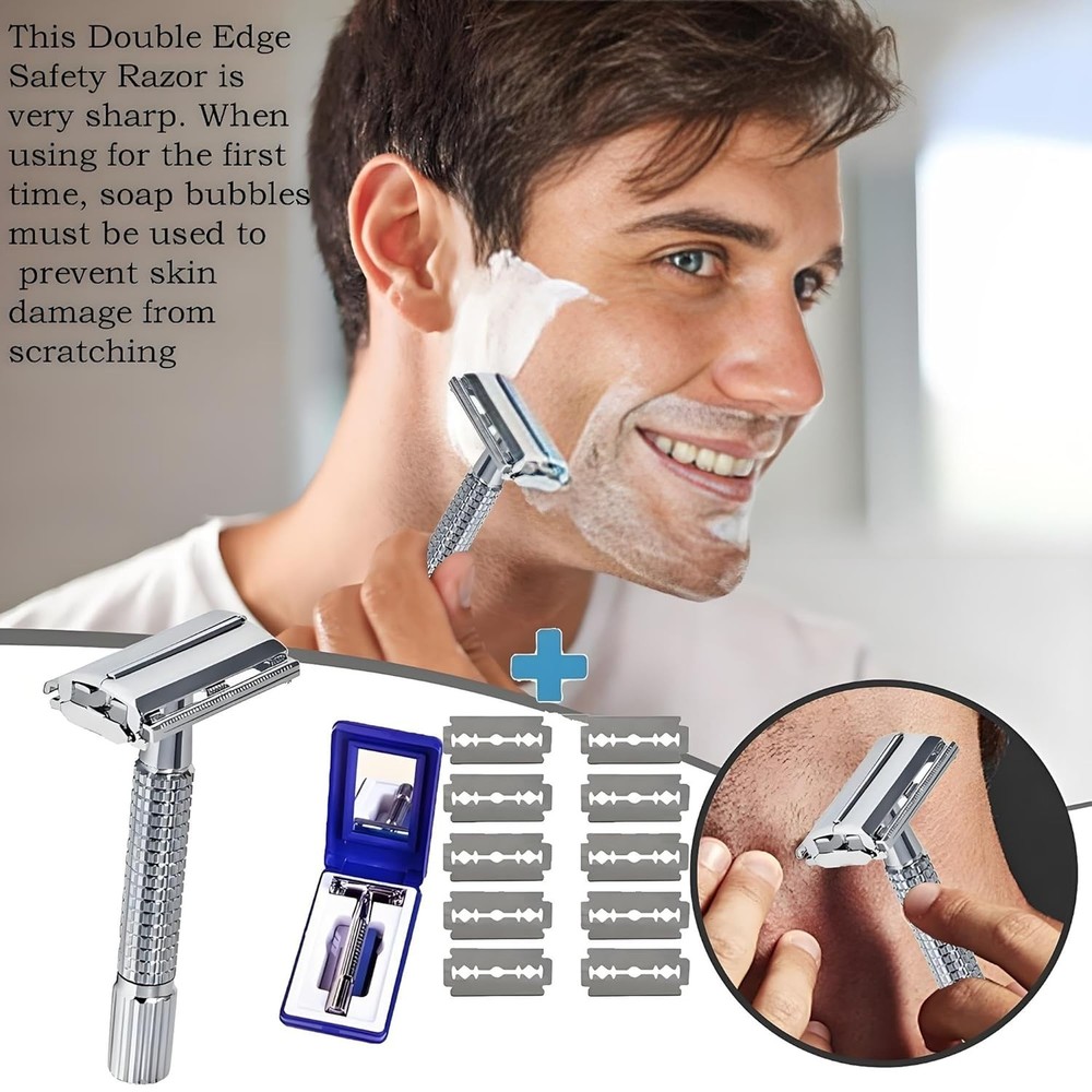 Double Edge Safety Razor for Unisex, 10 Platinum Coated stainless steel Product Details Package Dimensions : 4.33 x 2.56 x 1.26 inches; 3.53 ounces Manufacturer : Double Edge Safety Razo Country of Origin : China Brand: EIen Number of Blades: 1 Unit Count: 1 Count Special Feature: Double Edge Skin Type: Sensitive This blade is very sharp, sharper than a regular blade. If it is the first time to shave, it is essential to use foaming soap because the face has bumpy muscles. The blade quickly shaves off the protruding parts of the irregular muscles, which can cause bleeding. However, the use of foam helps to create a smooth surface. These blades are designed primarily for coarse facial hair, and the second use will not be as sharp as the first time. You can simply moisten your beard with water. Stainless steel blades. Includes 10 High-Quality Platinum-coated stainless steel double edged razor blades to shape with accuracy Double edged safety razor. A single blade razor designed for edging sideburns and strong beard lines to help you achieve your perfect look Double Edge Safety Razor for Unisex, Safety Razo, Women Men's Razor with a Delicate Box, Fits All Double Edge Razor holder PACKAGE CONTENT – 1 safety razor (single blade razor), 10 platinum-coated Swedish steel mild blades, 1 luxury case. This is the ideal gift or present for birthdays, anniversaries, Christmas, Valentines, Father’s or Mother’s day. THE SMOOTHEST SHAVE for both men & women – Significantly reducing ingrown hair, skin irritations and razor burn often experienced with plastic cartridge razors, helping you finally achieve the smoothest, cleanest and closest shave. ECO FRIENDLY – Unlike costly disposable cartridge razors, when you purchase this product, the entire razor and all its refill blades contains zero plastic, thus 100% reusable and recyclable. The pinnacle of over a century's worth of innovation and expertise, and the only range that bears the name of our company's founder: This safety razor for men is an iconic design inspired by our heritage, for edging with ultimate precision, classic function and style. A single Platinum coated double edged safety razor blade shapes with precise accuracy, ideal for edging sideburns and strong beard lines to help you achieve your perfect look. Our closed comb head design, perfected a century ago, allows for great control, while the high-quality chrome plated handle ensures long-lasting durability. Includes 10 Platinum coated stainless steel double edged razor blades for a precision finish and lasting durability. How to insert a new blade: first, hold the razor upside down, unscrew the handle and lift off the blade guard and old blade. Second, place a new blade on to the cap using the central screw and two location posts to keep the blade straight. Lastly, replace the guard and reattach the handle by turning clockwise until fully tightened.