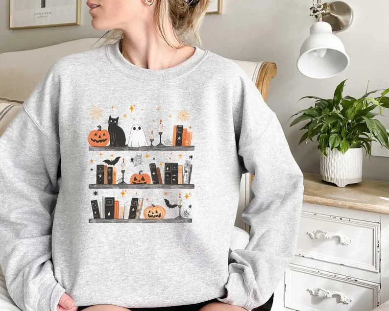 Unisex sweatshirt featuring a charming Halloween bookshelf design with stacked books, pumpkins, a black cat, ghost, candles, and bats. A cozy and spooky design that’s perfect for book lovers and Halloween fans alike. Key Features: Material: Soft cotton blend (cotton + polyester) for comfort and durability Style: Unisex – suitable for both men and women Print: Halloween-themed bookshelf with ghost, pumpkins, cat, and bats (high-quality, long-lasting print) Available in multiple colors Great for Halloween, fall reading season, book lovers, or casual autumn wear Available Sizes: S, M, L, XL, 2XL, 3XL, 4XL Care Instructions: Machine wash cold or hand wash recommended Do not bleach Turn inside out before washing and ironing to preserve the design