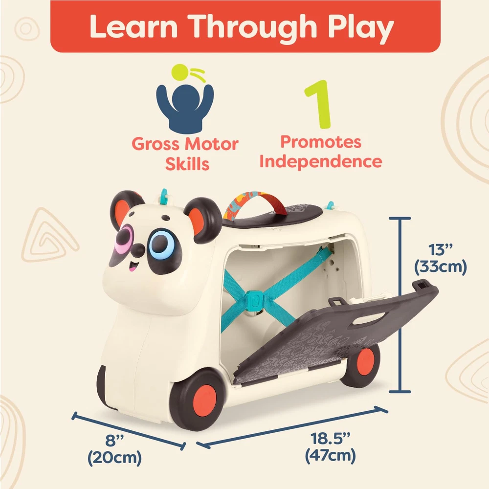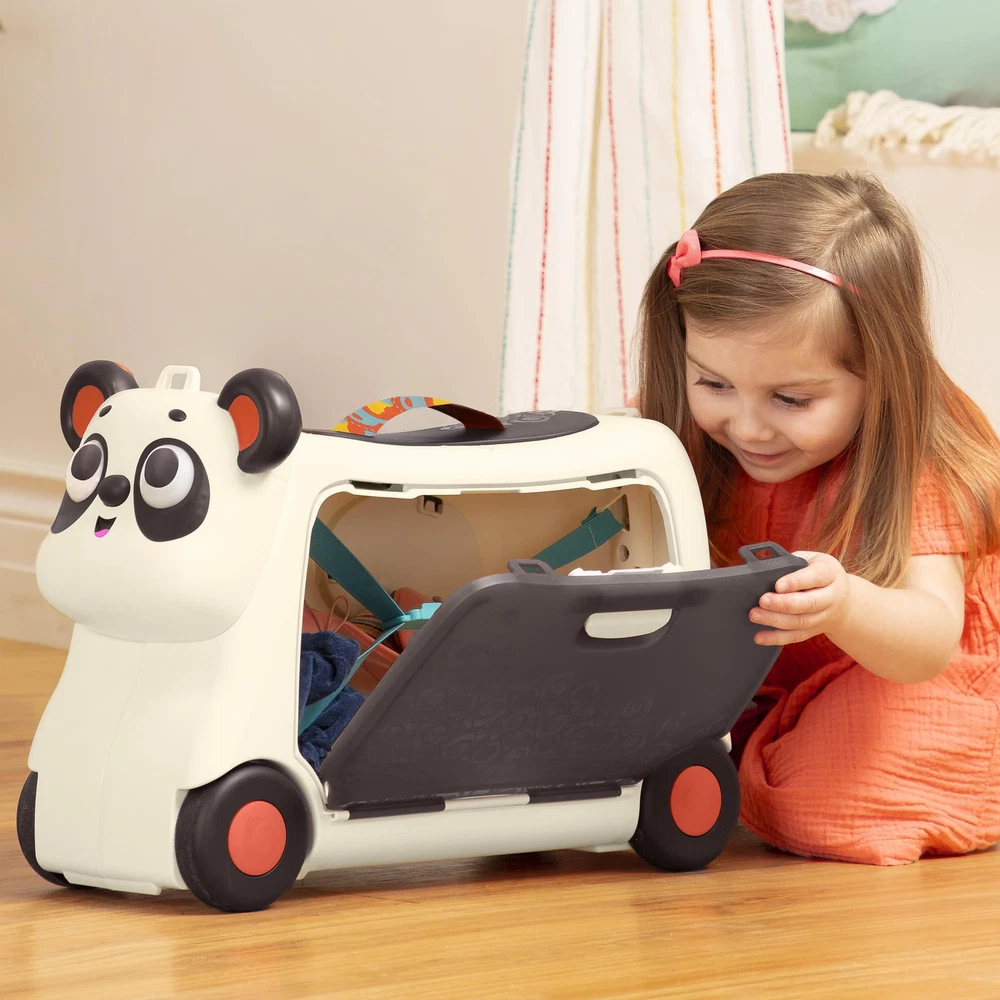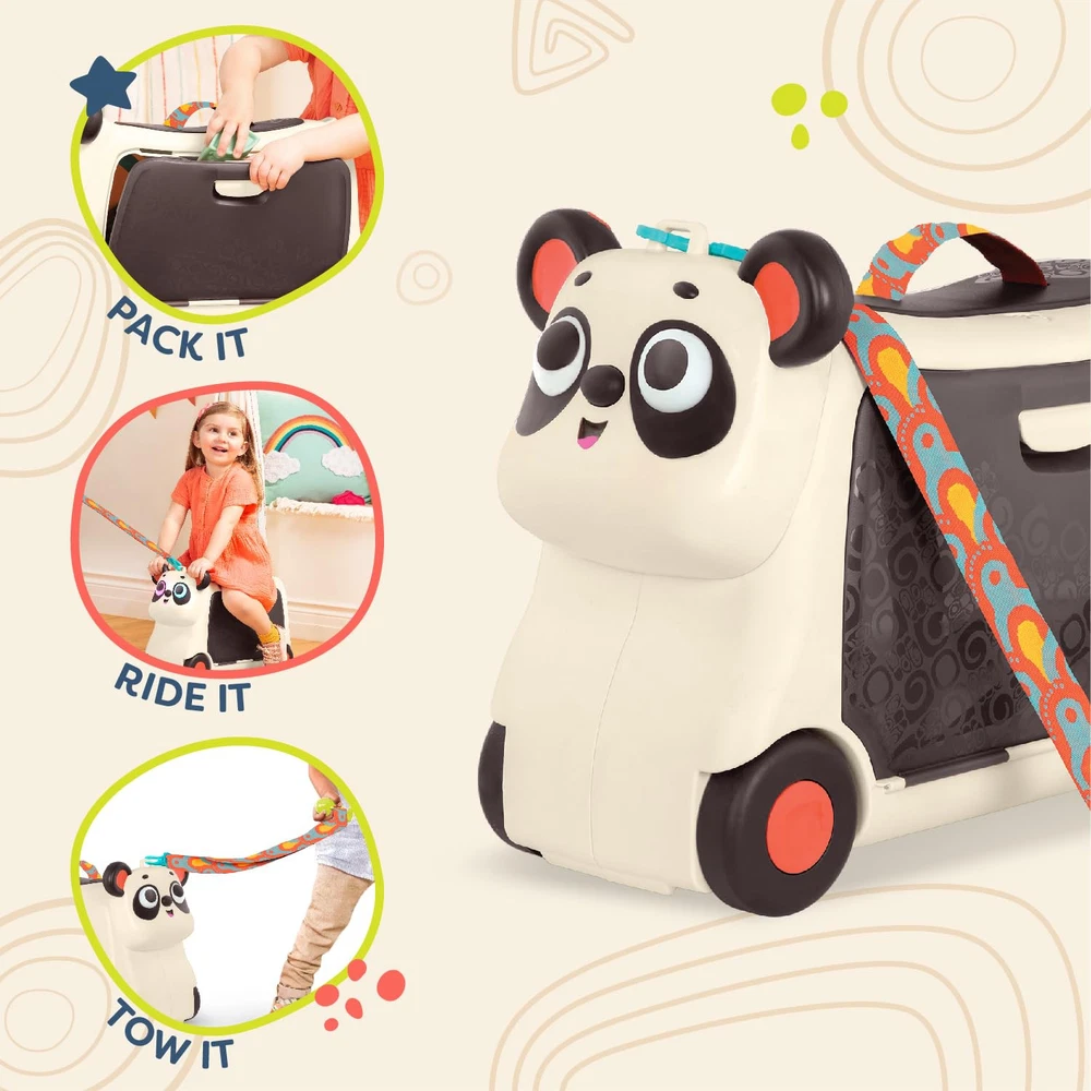 Bring your lil' treasures anywhere you go with the Bingo Gogo Ride-On from Land of B.! Whether you’re jetting off on a trip or sleeping over at a friend’s house, this ride-on toy can easily double as a little suitcase. Measuring 18.8” (L) x 7.7” (W) x 13.6” (H), the Gogo Ride-On has enough storage space to hold your ’s precious belongings and includes handy interior elastic straps that help those belongings stay put. This panda ride-on is also equipped with a detachable strap and a little leaf handle, making it easy for your to pull along. Not to mention that the leaf doubles as the key that locks it up! Designed with fun in mind, this ride-on is inspired by the Land of B. character Bingo who comes alive with multicolored, luminous eyes and sound effects! 3 AAA batteries are required and included. Recommended for children 2 years and over. Ride-On Suitcase: A lightweight and sturdy ride-on toy that can double as a carry-on sized suitcase! Fun Features: Press the buttons on Bingo's ears for lights and sounds! (3 AAA batteries are included.) Storage Space: This lockable ride-on comes with plenty of storage – great for sleepovers or travel! Weight: The Gogo Ride-On luggage for holds up to 110 lbs (50 kg). Age: This panda ride-on is recommended for toddlers 2 years +
