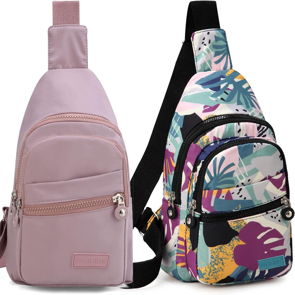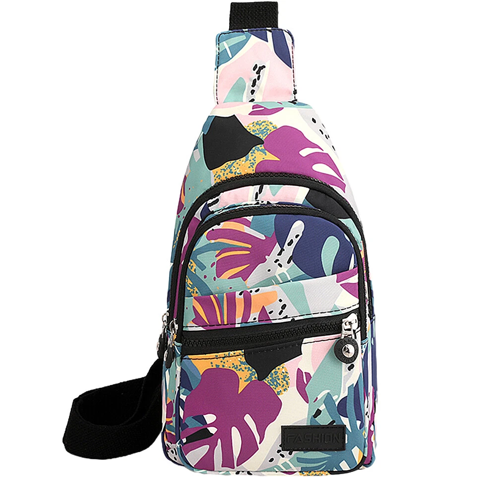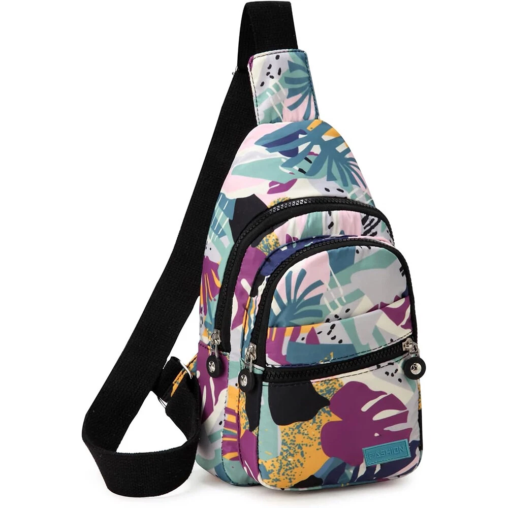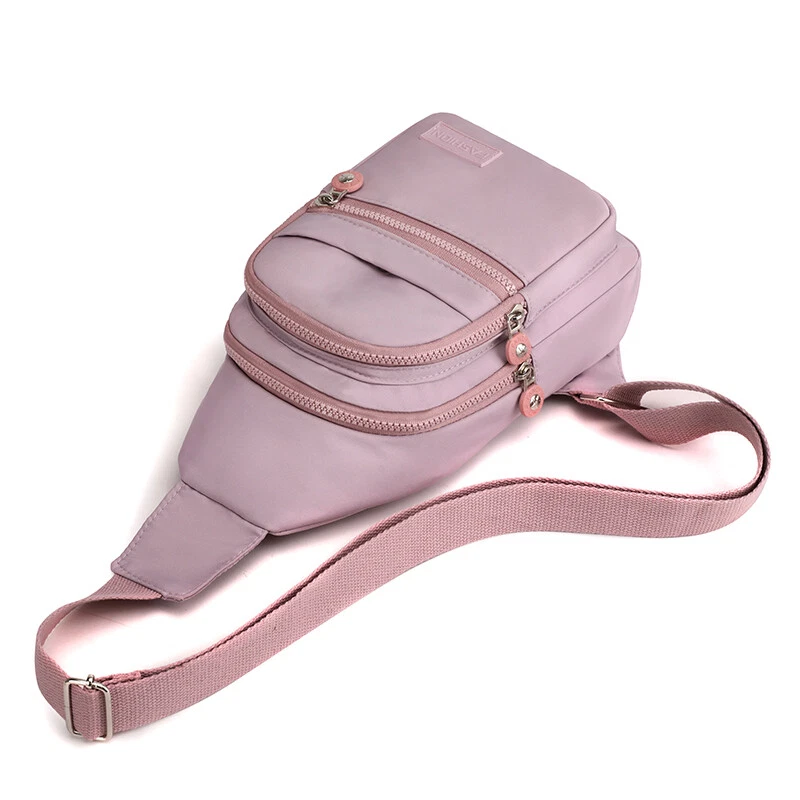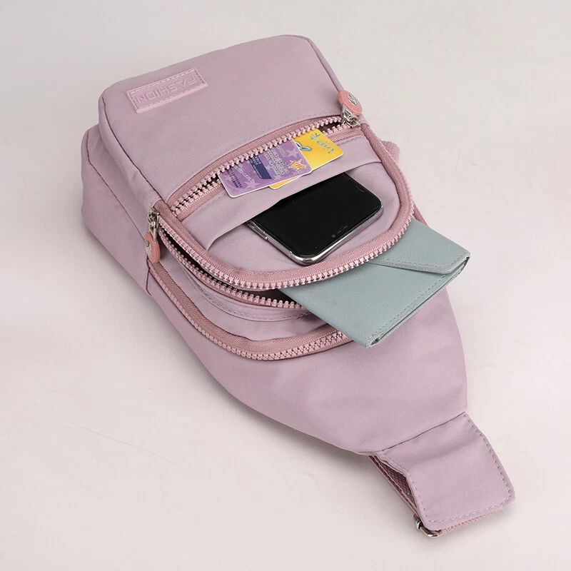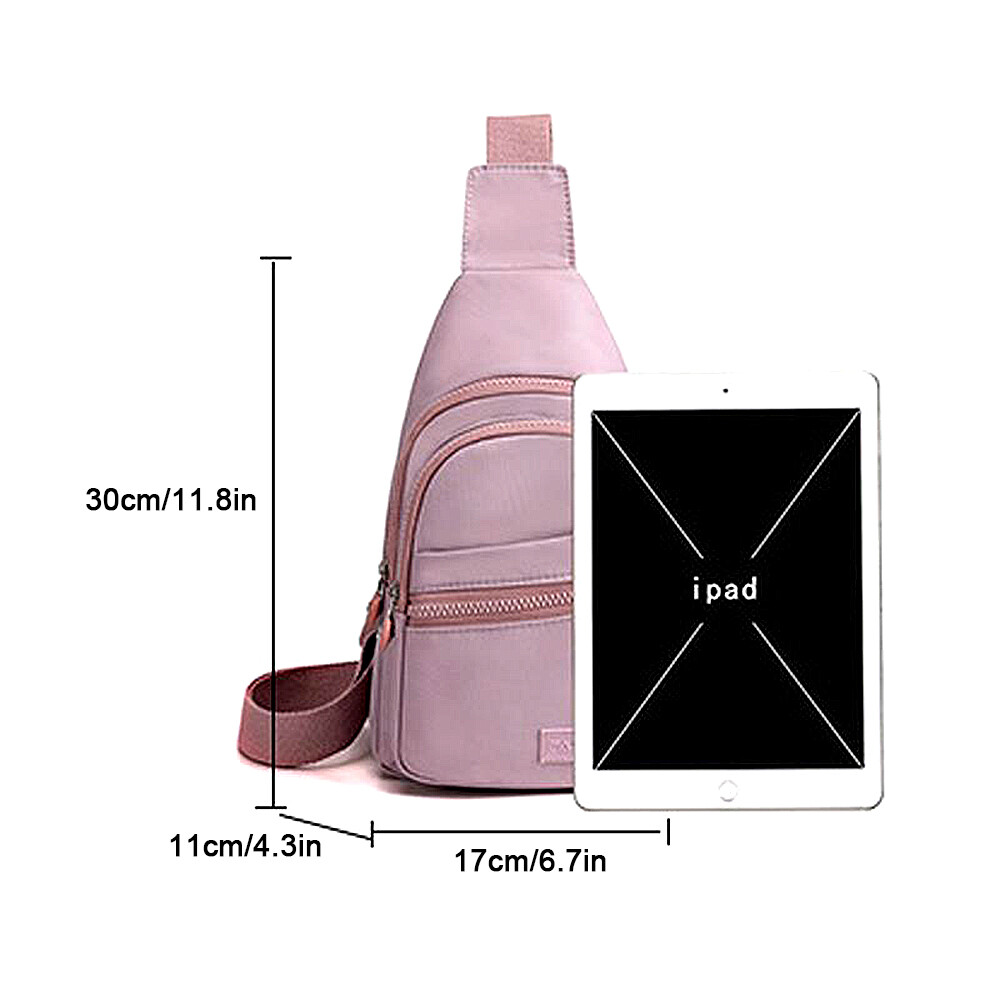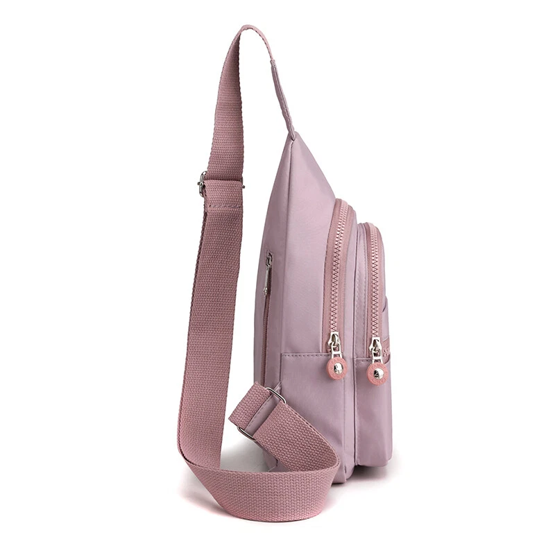 Package includes: 1 x sling backpack women Material: Nonly Color: pink purple Size: 6.7” x 4.3” x 11.8” (Length x Width x Height) Features: - Water Resistant - Multi-Compartment - Large Capacity - Hidden Anti-Theft Pocket - Light weight - With the addition of its unique color. - as a travel bag and a hiking bag - as a purse or day pack.