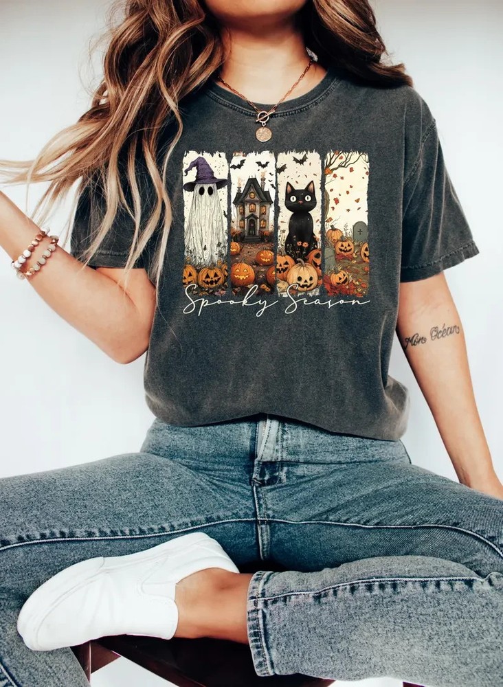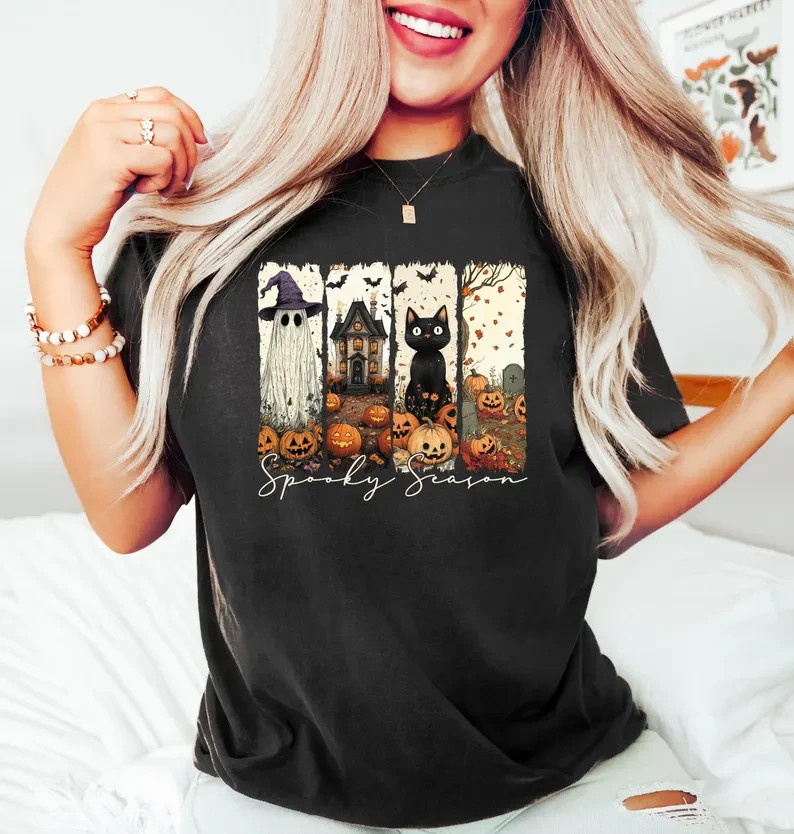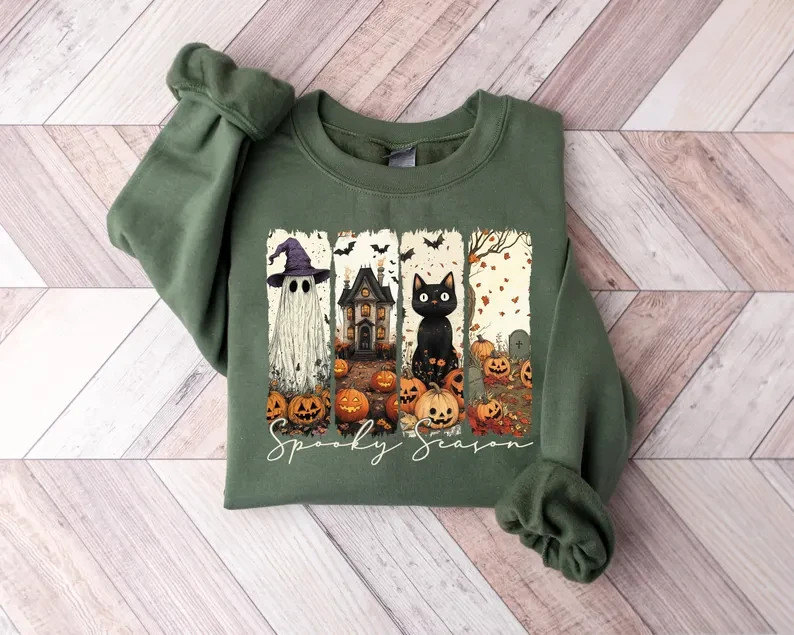 Unisex sweatshirt featuring a charming “Spooky Season” design with ghost, haunted house, black cat, pumpkins, and bats. Perfect for Halloween lovers who want a cozy yet festive look for the spooky season. Great for casual wear, fall outings, or Halloween parties. Key Features: Material: Soft cotton blend (cotton + polyester) for comfort and durability Style: Unisex – suitable for both men and women Print: Halloween-themed ghost, cat, haunted house, and pumpkin design (high-quality, long-lasting print) Available in multiple colors Great for fall, Halloween parties, and casual everyday wear Available Sizes: S, M, L, XL, 2XL, 3XL, 4XL Care Instructions: Machine wash cold or hand wash recommended Do not bleach Turn inside out before washing and ironing to preserve the design