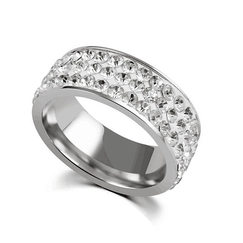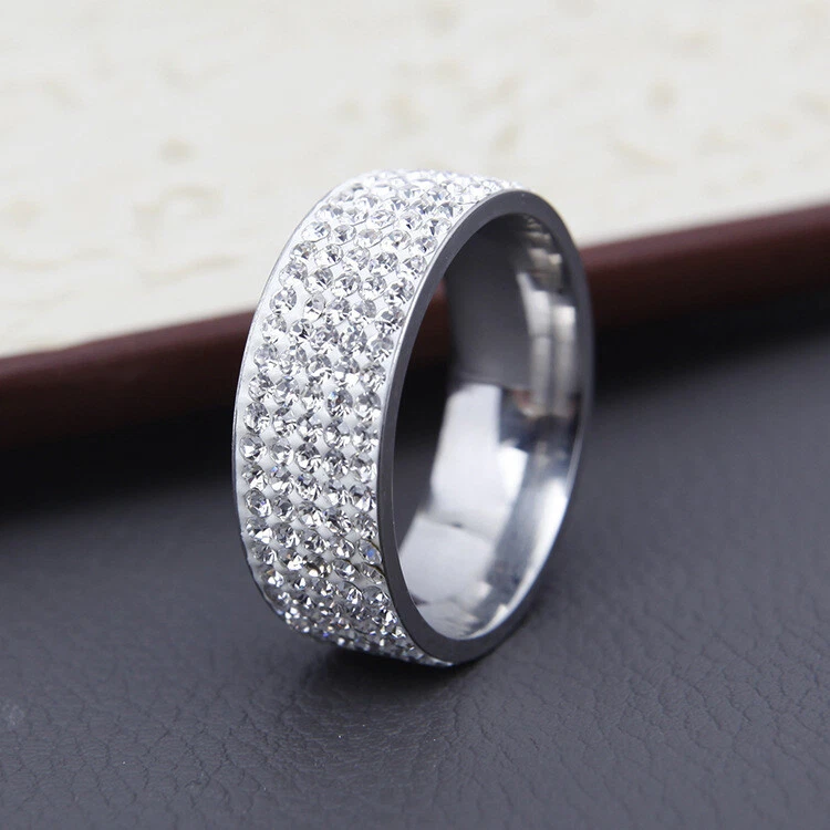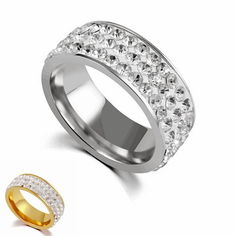 Men Women Stainless Steel Crystal Band Ring Gold Silver Wedding Band Ring Sz6-13 Condition: 100% Brand New and High Quality ! Material: Stainless Steel Color: Silver, Gold Size: 6,7,8,9,10,11,12,13 Width: 8mm Weight:5.6g Package Included: 1PCS Fashion Ring(OPP bag)