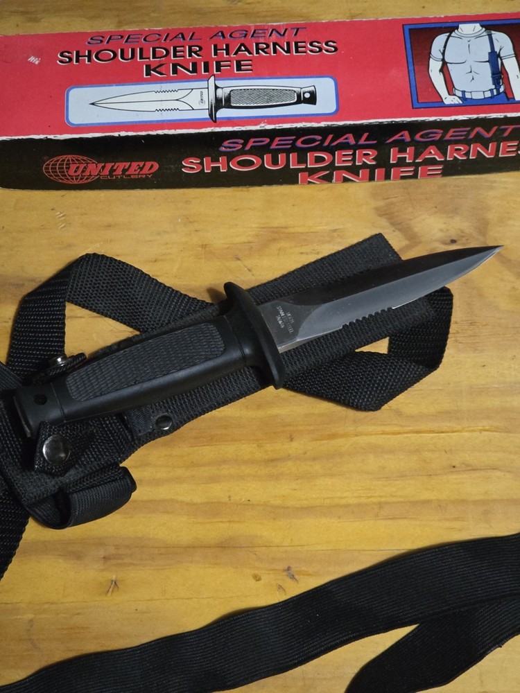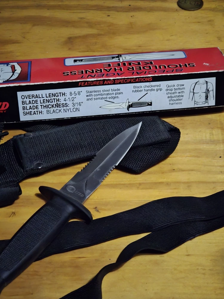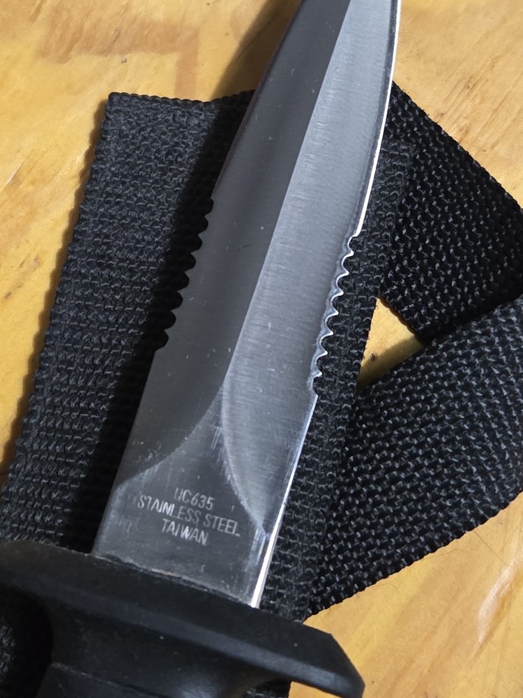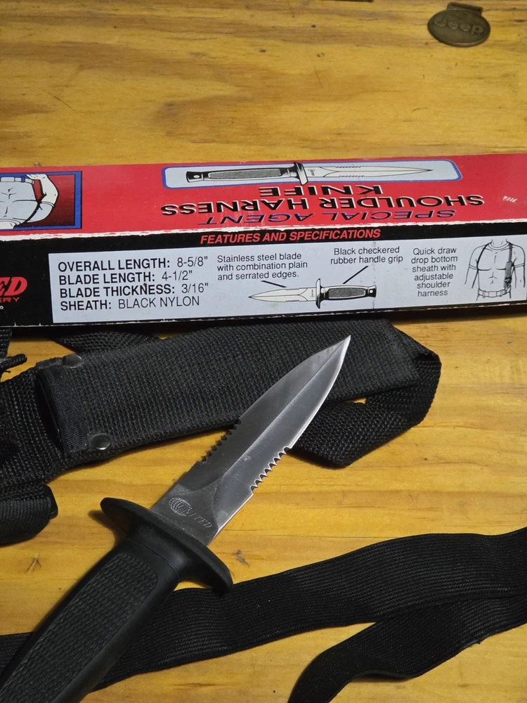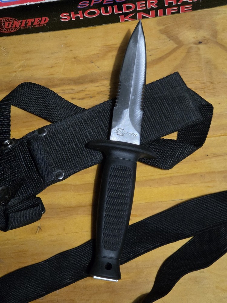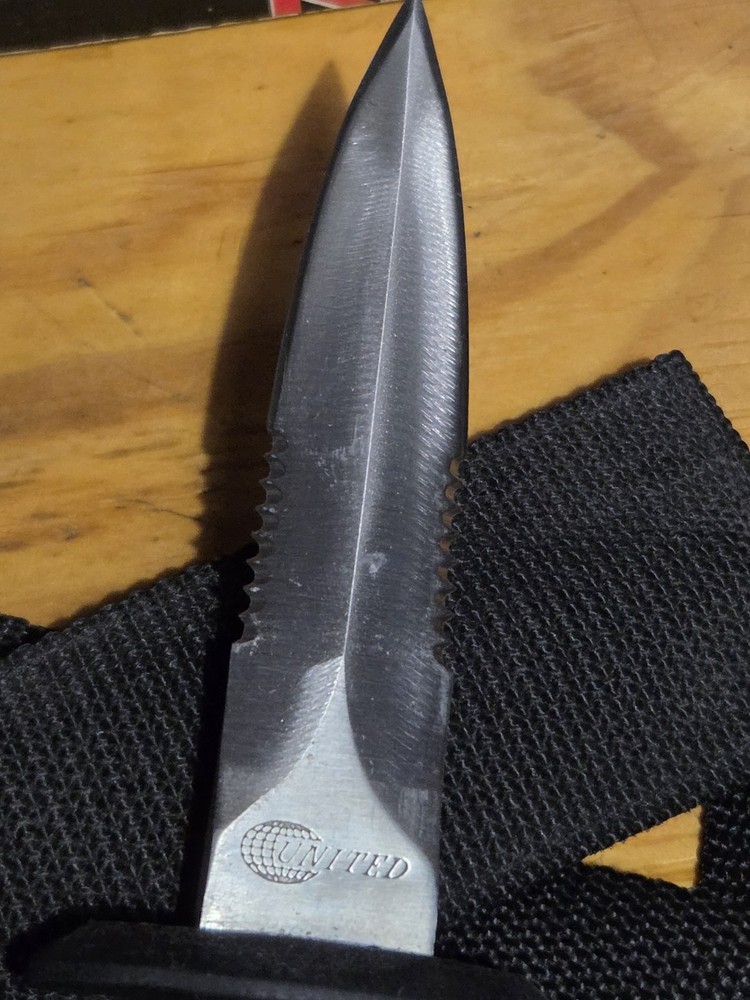 Brand: United Cutlery Blade Type: Spear Point Handle Material: Rubber Tang: Full Original/Reproduction: Original Dexterity: Ambidextrous Blade Edge: Combination Blade Material: Stainless Steel