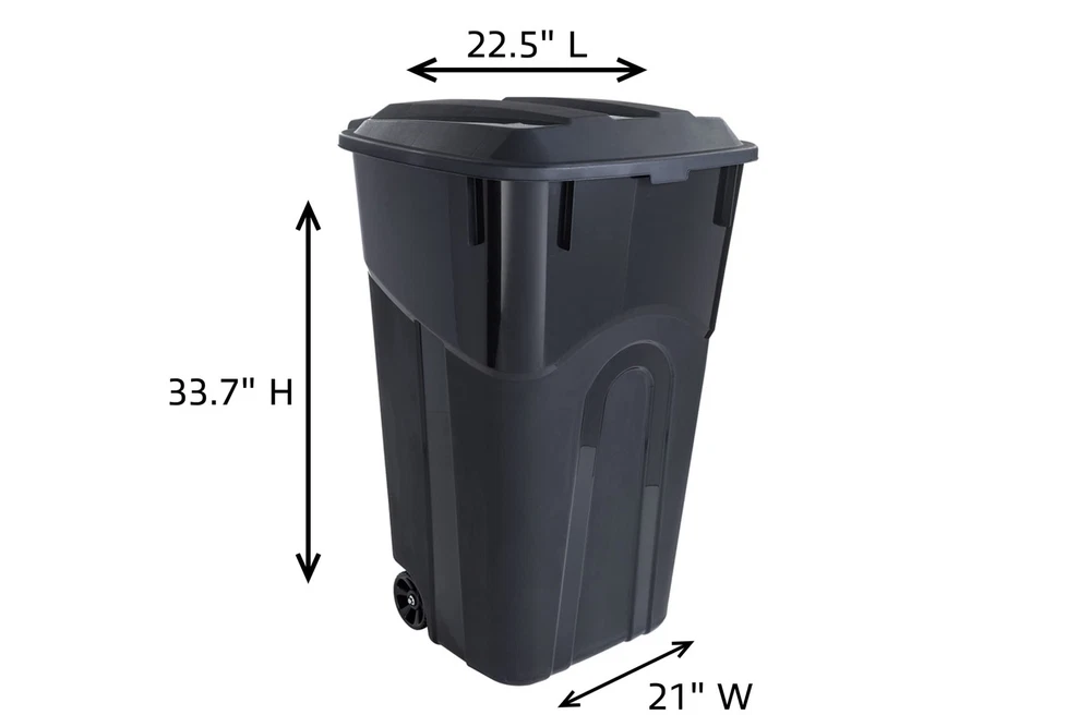 This 32 Gallon Trash Can with wheels and attached lid is perfect for heavy loads and a wide variety of contents. Use it as a trash or recycling bin. It is ideal for use indoors, outdoors, in the garage, basement, and everywhere in between. United Solutions' 32-gallon trash cans are strong, durable, sturdy and reliable. With a securely attached lid, you can feel confident that its contents are safe and secure. Tote the large trash can with lid around on its rugged wheels. With the capacity of 64 pounds, you can load it up and easily transport this big trash can with the ergonomic handle. Constructed with heavy duty polypropylene and high-quality construction, this garbage can with lid is ideal to endure extreme temperatures and rough use. Capitalize on its versatility, and use this trash can in your basement, kitchen, garage, back yard, and more. Product Dimensions – 22.5” L x 21” W x 33.7” H. Securely Attached Lid – With the attached snap lock lid, this trash can will make it simple to place trash inside and keep it there. Leave this trash can with lid in your driveway backyard and know that everything is secure, even in windy conditions. Heavy Duty Handle – Make transportation effortless with the comfortable and easy to grip handle on this black trash can with wheels. Paired with the integrated wheels, getting this 32 gallon trash can to the curb and back has never been easier. Rugged Wheels – Built tough, these wheels make for smooth transport while the garbage can is in use, making this perfect for outside use on your patio, deck or in your garage. Tote this trash bin wherever you need it to go without having to lift it. Withstand the Elements – This outdoor trash can is with heavy-duty polypropylene and durable construction to endure extreme temperatures and rough use. The large bin on wheels is impact resistant and can be trusted on rough terrain and smooth ground. Multiple Uses - The sleek design and size of this black trash can make it a versatile addition to any space. Perfect for use in the garage, on the patio, or at the office. Use it as a dog food bin, recycle bin, deck storage container, and more.