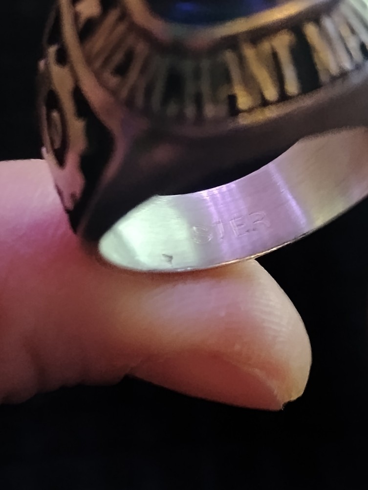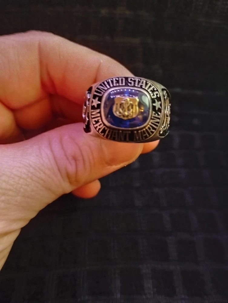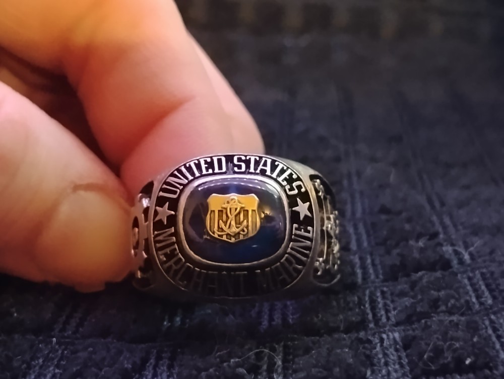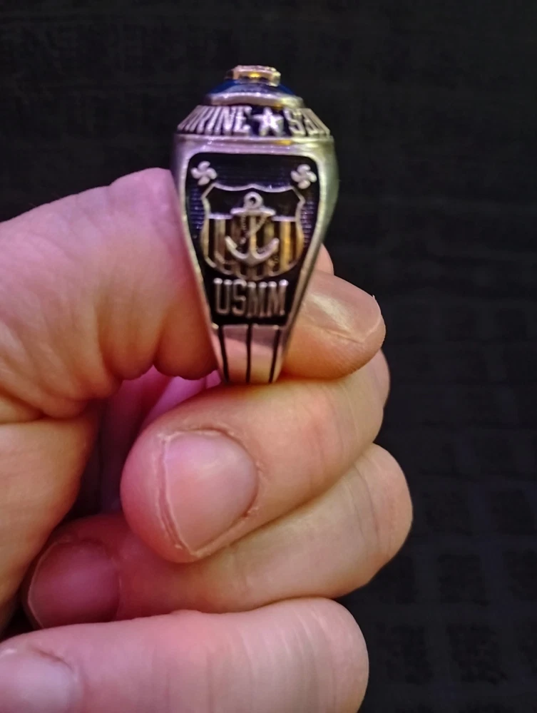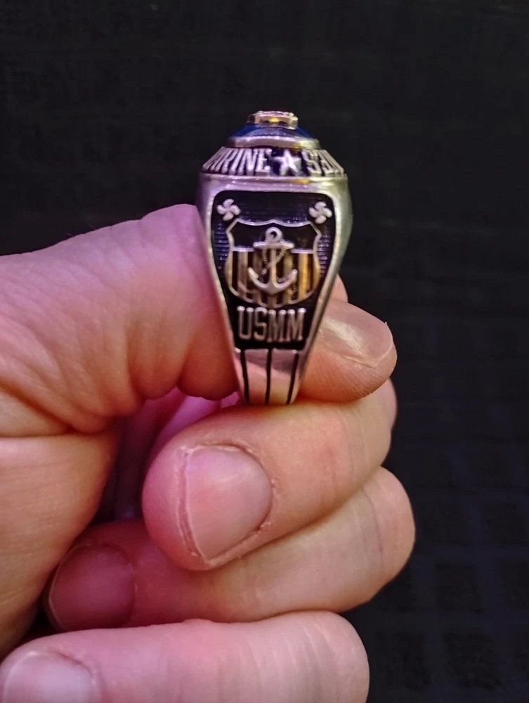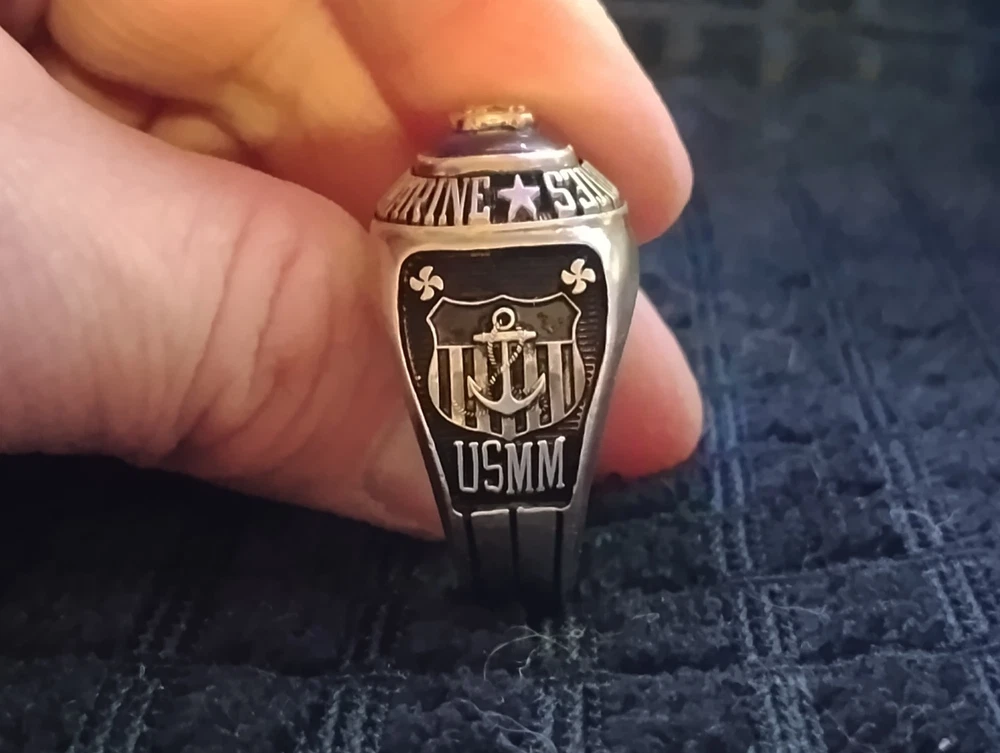 The product is a United States Merchant Marine USSM/EN ring made of sterling silver, with a size 13. This collectible item is themed around militaria, specifically the Navy force. It is a patriotic and military-themed accessory that would be a great addition to any collection or as a display piece for those who appreciate military history and symbolism. it has 1948-1952 engraved on the inside along with the initials of tk.